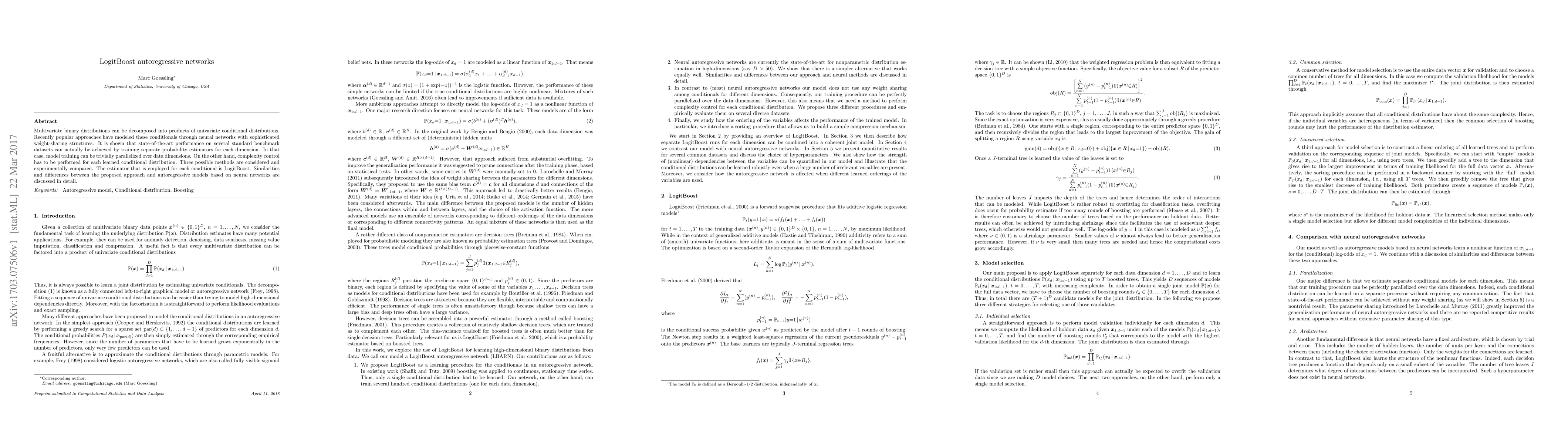 This paper proposes LogitBoost autoregressive networks for modeling multivariate binary distributions by training separate probability estimators for each dimension, achieving state-of-the-art performance on benchmark datasets. It compares three methods for complexity control and discusses the similarities and differences to traditional autoregressive neural networks.