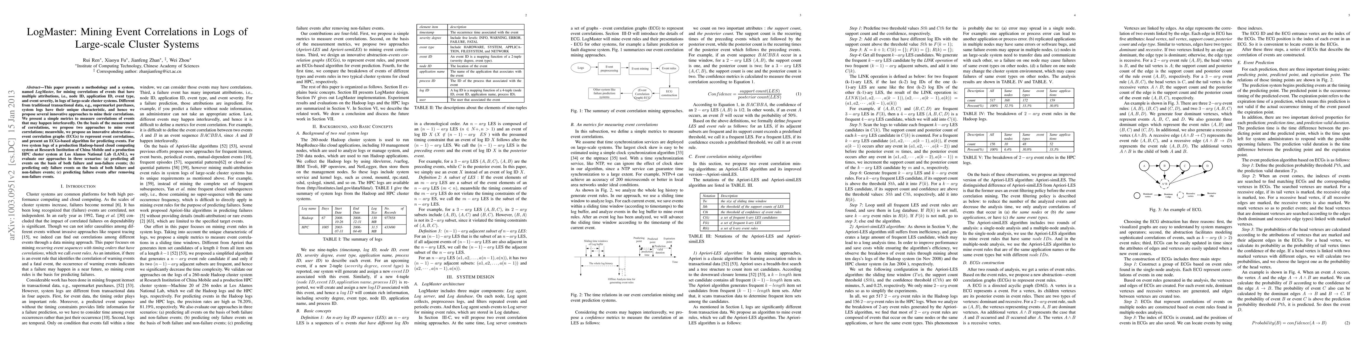 LogMaster is a methodology and system for mining correlations among events in large-scale cluster system logs, using innovative approaches to handle unique log characteristics. It introduces event correlation graphs (ECGs) and evaluates its effectiveness in predicting events in two production systems.