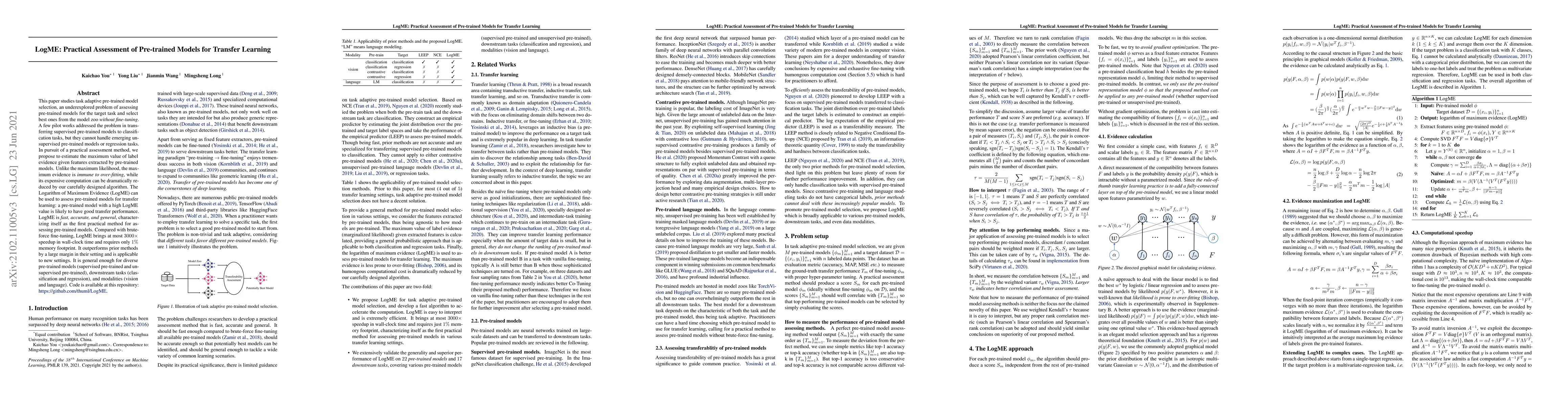 This paper introduces LogME, a practical method for assessing pre-trained models for transfer learning without fine-tuning, estimating the maximum value of label evidence from extracted features. LogME is fast, accurate, and general, offering up to 3000× speedup compared to fine-tuning and applicable to various pre-trained models and tasks.