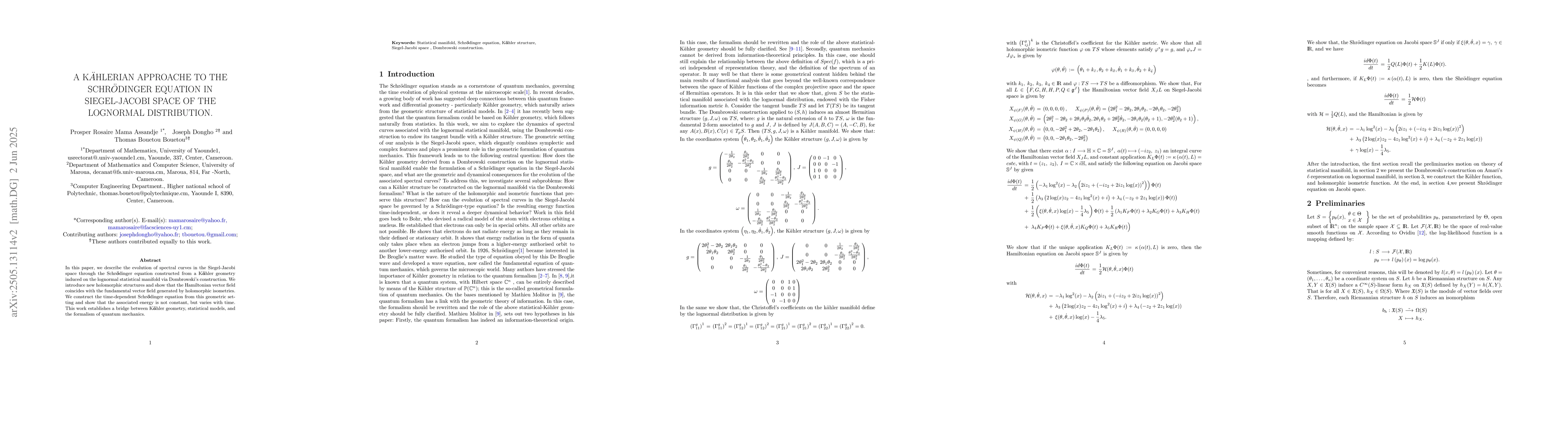 The introduction of new holomorphic structures and the construction of a time-dependent Schrodinger equation from Kahler geometry on lognormal statistical manifolds.
