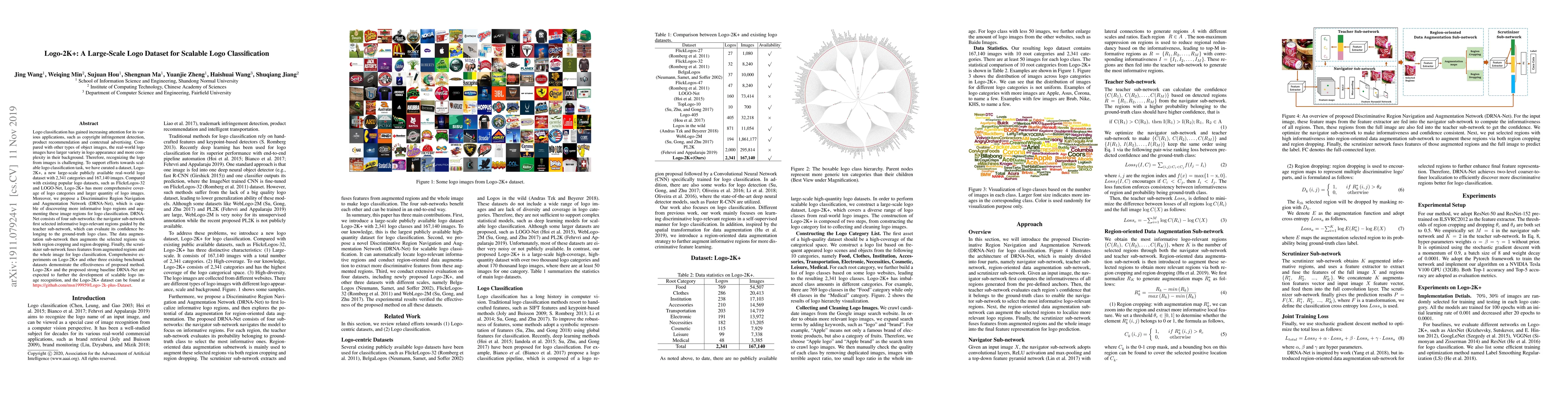 Logo-2K+ is a large-scale dataset with 2,341 categories and 167,140 images to support scalable logo classification. The paper also introduces DRNA-Net, a network for discovering and augmenting informative logo regions to enhance classification performance.