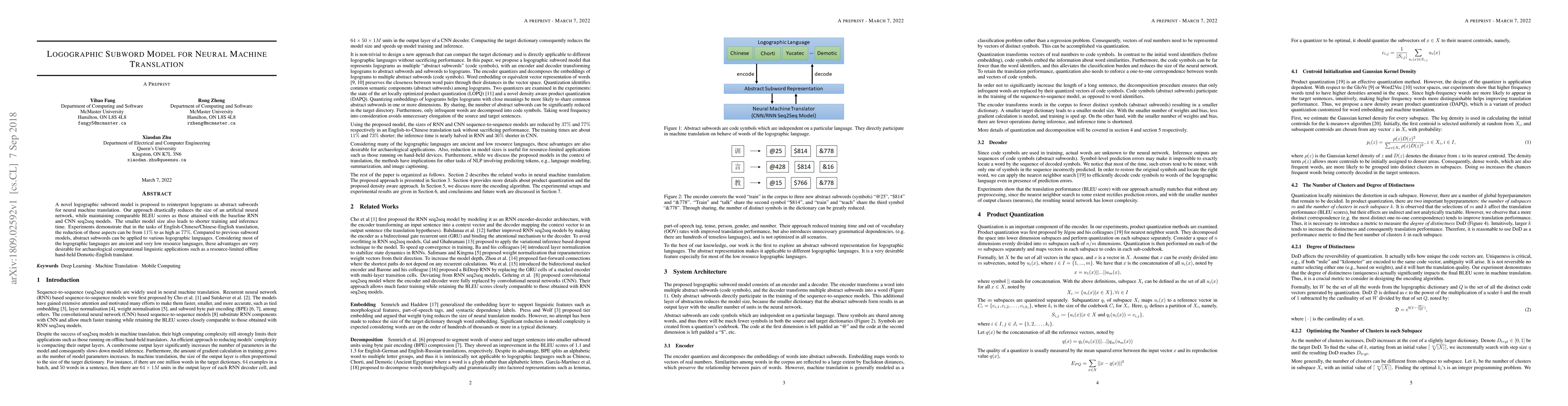 A novel logographic subword model is proposed to reinterpret logograms as abstract subwords for neural machine translation. Our approach drastically reduces the size of an artificial neural network, while maintaining comparable BLEU scores as those attained with the baseline RNN and CNN seq2seq models. The smaller model size also leads to shorter training and inference time. Experiments demonstrate that in the tasks of English-Chinese/Chinese-English translation, the reduction of those aspects can be from $11\%$ to as high as $77\%$. Compared to previous subword models, abstract subwords can be applied to various logographic languages. Considering most of the logographic languages are ancient and very low resource languages, these advantages are very desirable for archaeological computational linguistic applications such as a resource-limited offline hand-held Demotic-English translator.