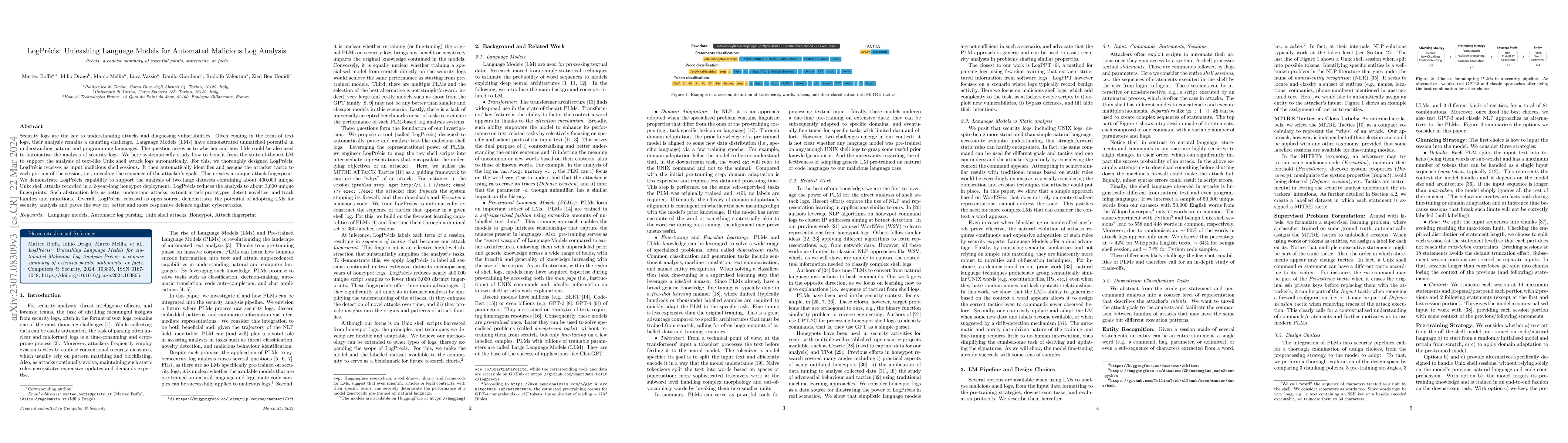 This paper explores the application of state-of-the-art language models (LMs) for automated analysis of Unix shell attack logs, presenting LogPr\'ecis, a methodology that automatically identifies attacker tactics within raw shell sessions. LogPr\'ecis reduces complex attack datasets into manageable fingerprints, aiding analysts in understanding, detecting, and tracking cyberattack sequences and mutations.