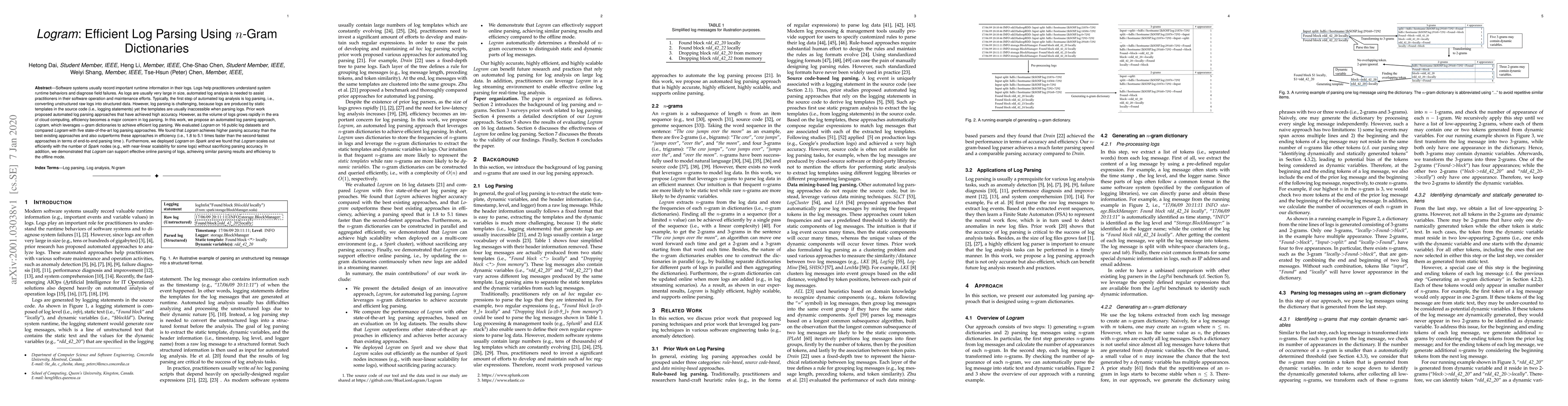 Logram efficiently parses logs using n-gram dictionaries, achieving similar accuracy to existing approaches while outperforming them in efficiency, and demonstrating scalable performance with Spark.