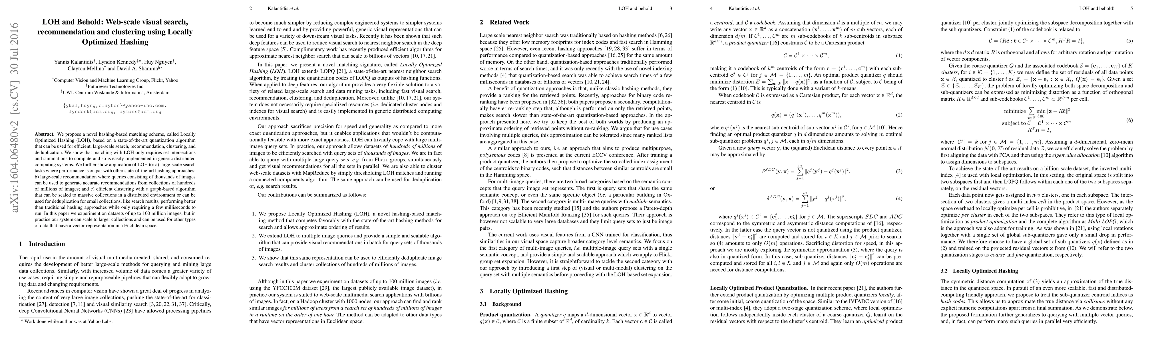 This paper introduces Locally Optimized Hashing (LOH), a novel hashing-based matching scheme for efficient web-scale search, recommendation, and clustering. LOH leverages a state-of-the-art quantization algorithm, enabling scalable performance on large datasets of up to 100 million images.
