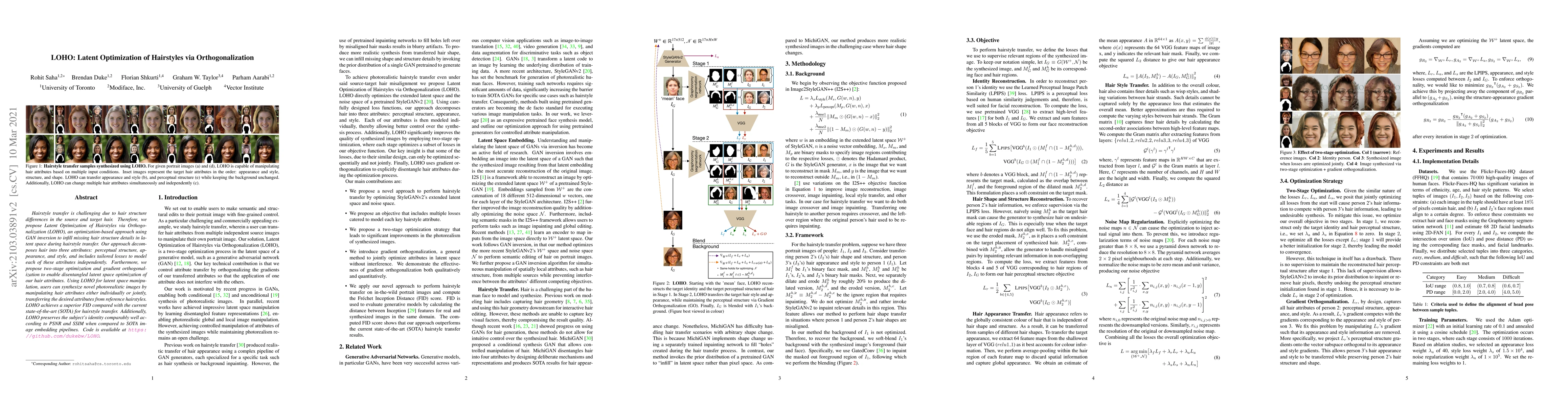 LOHO proposes an optimization-based method for transferring hairstyles using GAN inversion and orthogonalization to disentangle hair attributes in latent space, achieving superior FID and maintaining subject identity. The approach enables users to manipulate hair attributes for photorealistic image synthesis.