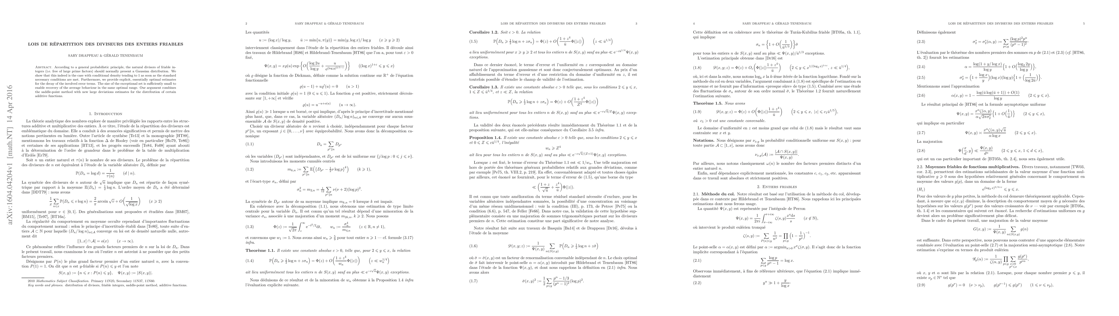 According to a general probabilistic principle, the natural divisors of friable integers (i.e.~free of large prime factors) should normally present a Gaussian distribution. We show that this indeed is the case with conditional density tending to 1 as soon as the standard necessary conditions are met. Furthermore, we provide explicit, essentially optimal estimates for the decay of the involved error terms. The size of the exceptional set is sufficiently small to enable recovery of the average behaviour in the same optimal range. Our argument combines the saddle-point method with new large deviations estimates for the distribution of certain additive functions.