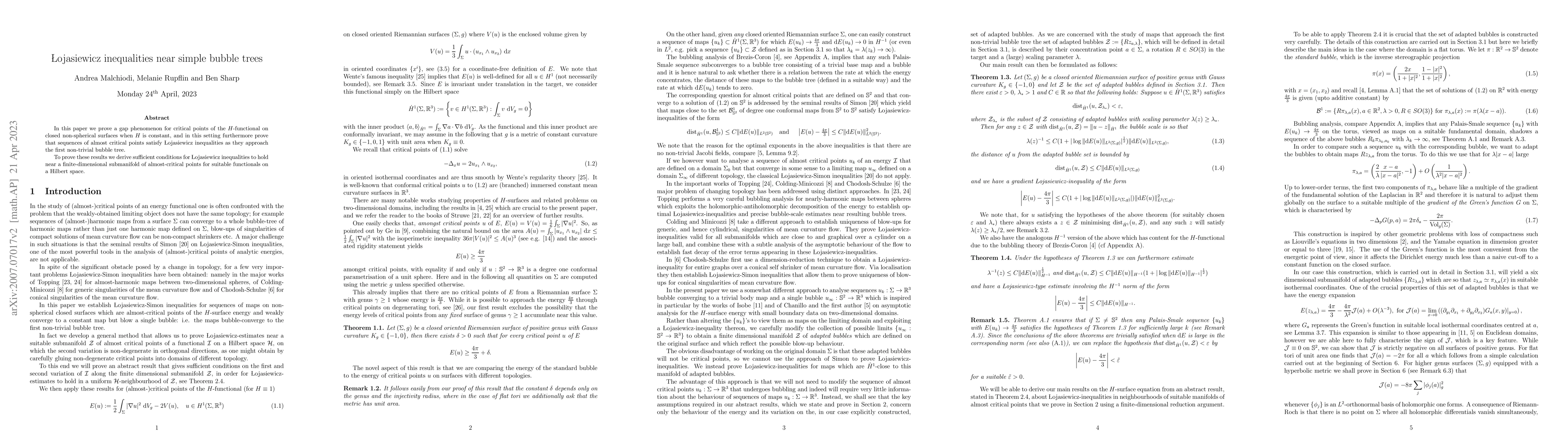 This paper establishes a gap phenomenon for critical points of the $H$-functional on non-spherical surfaces, proving that sequences of almost critical points satisfy {\L}ojasiewicz inequalities as they approach the first non-trivial bubble tree. The authors derive sufficient conditions for {\L}ojasiewicz inequalities near finite-dimensional submanifolds of almost-critical points for functionals on a Hilbert space.