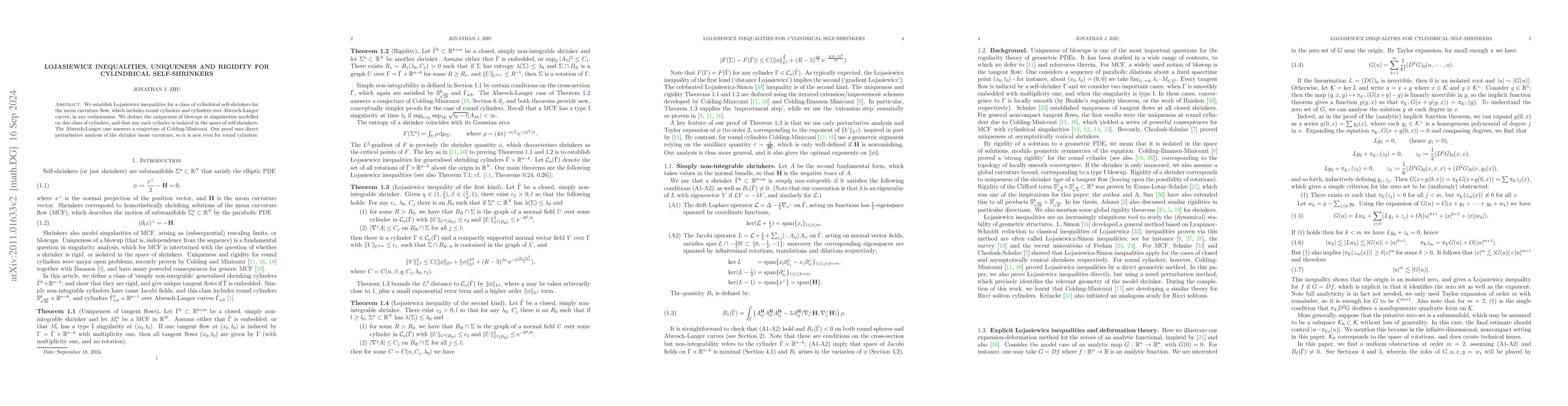The paper establishes {\L}ojasiewicz inequalities for cylindrical self-shrinkers in mean curvature flow, proving their uniqueness and rigidity. The method provides new insights even for round cylinders, resolving a conjecture for Abresch-Langer cylinders.