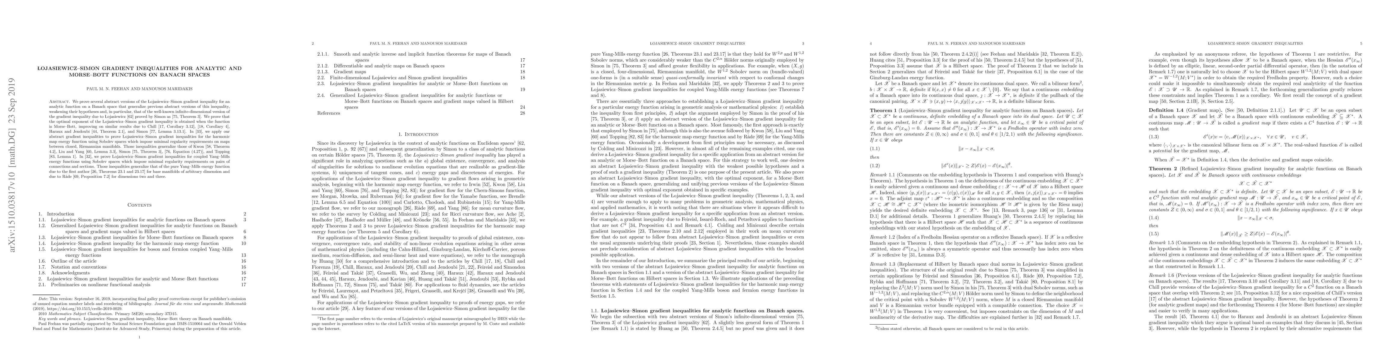 We prove several abstract versions of the Lojasiewicz-Simon gradient inequality for an analytic functional on a Banach space that generalize previous abstract versions of this inequality, weakening their hypotheses and, in particular, the well-known infinite-dimensional version of the gradient inequality due to Lojasiewicz proved by Simon (1983). We also prove that the optimal exponent of the Lojasiewicz-Simon gradient inequality is obtained when the functional is Morse-Bott, improving on similar results due to Chill (2003, 2006), Haraux and Jendoubi (2007), and Simon (1996). In our article arXiv:1903.01953, we apply our abstract Lojasiewicz-Simon gradient inequalities to prove a Lojasiewicz-Simon gradient inequalities for the harmonic map energy functional using Sobolev spaces which impose minimal regularity requirements on maps between closed, Riemannian manifolds. Those inequalities for the harmonic map energy functional generalize those of Kwon (2002), Liu and Yang (2010), Simon (1983, 1985), and Topping (1997). In our monograph arXiv:1510.03815, we prove Lojasiewicz--Simon gradient inequalities for coupled Yang--Mills energy functions using Sobolev spaces which impose minimal regularity requirements on pairs of connections and sections. Those inequalities generalize that of the pure Yang--Mills energy function due to the first author (Theorems 23.1 and 23.17 in arXiv:1409.1525) for base manifolds of arbitrary dimension and due to Rade (1992) for dimensions two and three.