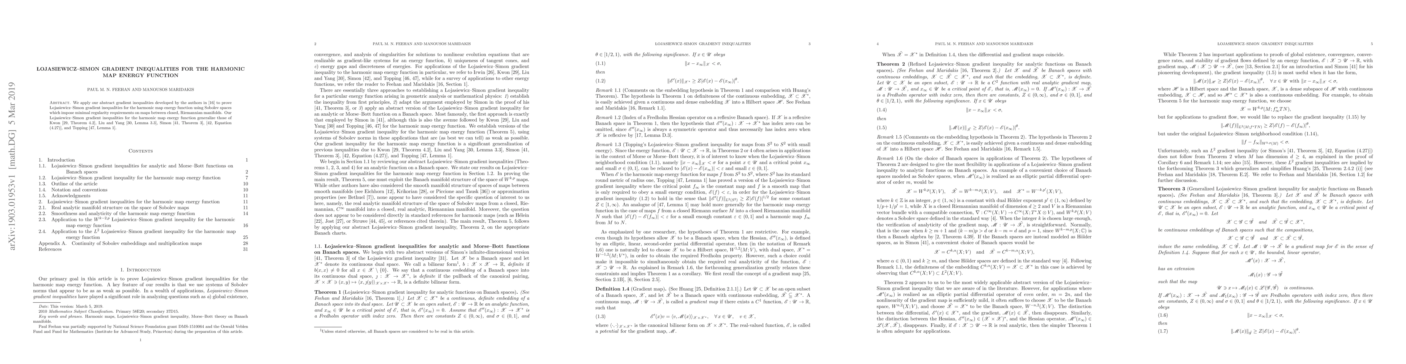 This paper proves Lojasiewicz-Simon gradient inequalities for the harmonic map energy function using abstract gradient inequalities and Sobolev spaces, generalizing previous results by Kwon, Liu and Yang, Simon, and Topping. The inequalities impose minimal regularity requirements on maps between closed Riemannian manifolds.