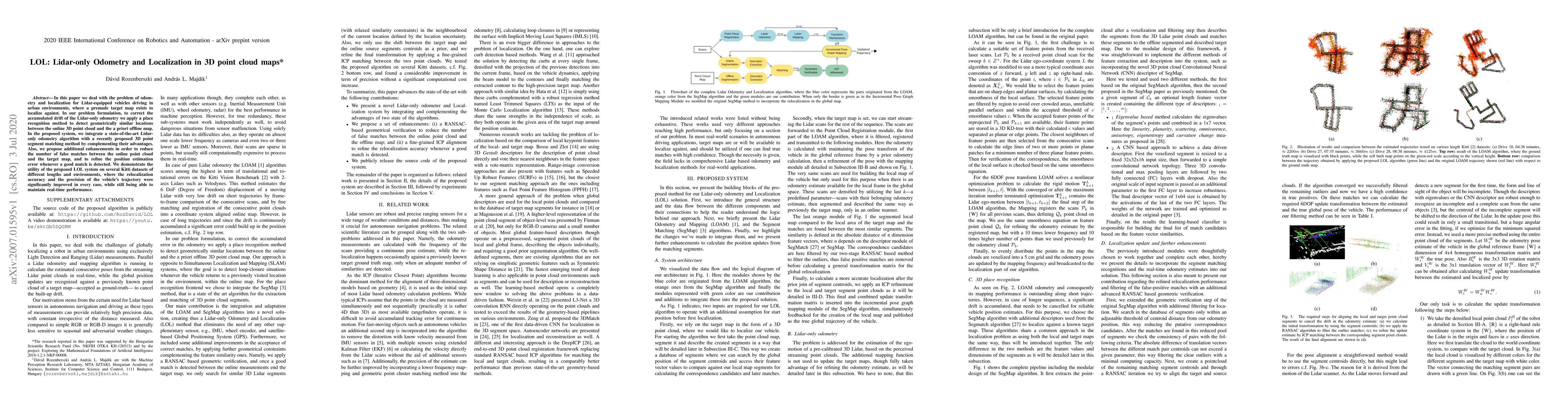 In this paper we deal with the problem of odometry and localization for Lidar-equipped vehicles driving in urban environments, where a premade target map exists to localize against. In our problem formulation, to correct the accumulated drift of the Lidar-only odometry we apply a place recognition method to detect geometrically similar locations between the online 3D point cloud and the a priori offline map. In the proposed system, we integrate a state-of-the-art Lidar-only odometry algorithm with a recently proposed 3D point segment matching method by complementing their advantages. Also, we propose additional enhancements in order to reduce the number of false matches between the online point cloud and the target map, and to refine the position estimation error whenever a good match is detected. We demonstrate the utility of the proposed LOL system on several Kitti datasets of different lengths and environments, where the relocalization accuracy and the precision of the vehicle's trajectory were significantly improved in every case, while still being able to maintain real-time performance.