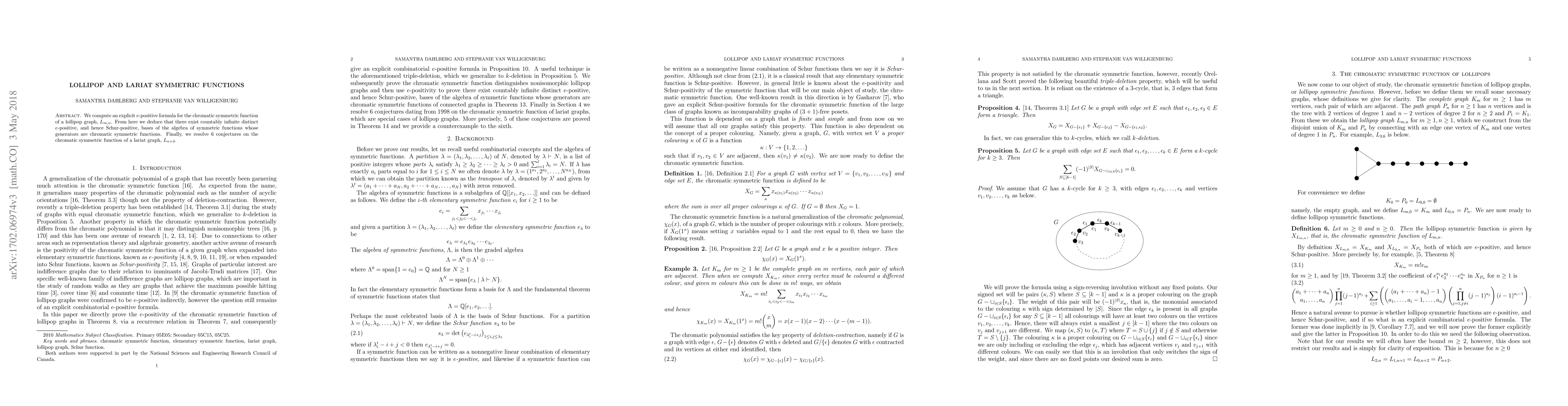 Researchers compute an explicit formula for the chromatic symmetric function of lollipop graphs, resolving 6 conjectures on lariat graphs and showing a countably infinite number of distinct bases for the algebra of symmetric functions.