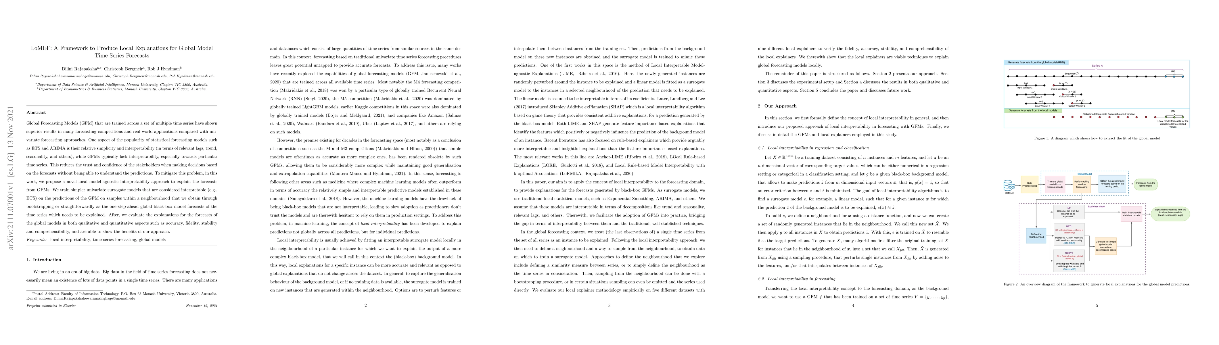 The paper proposes LoMEF, a framework to generate local explanations for global model time series forecasts, addressing the lack of interpretability of complex global forecasting models. It uses simpler, interpretable univariate models to explain the predictions of global models, demonstrating improved accuracy, fidelity, stability, and comprehensibility in explanations.