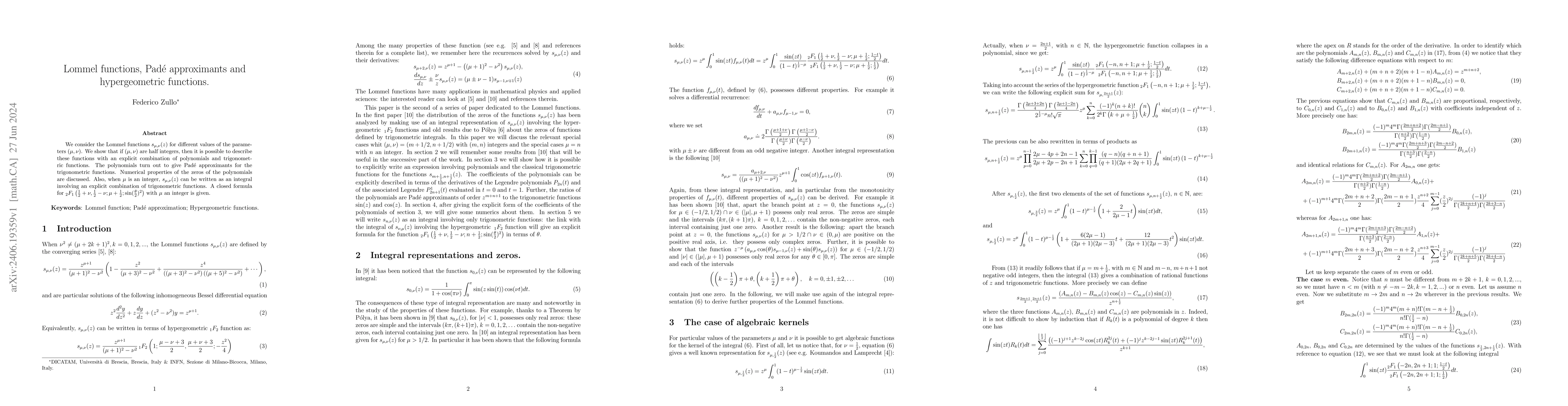 We consider the Lommel functions $s_{\mu,\nu}(z)$ for different values of the parameters $(\mu,\nu)$. We show that if $(\mu,\nu)$ are half integers, then it is possible to describe these functions with an explicit combination of polynomials and trigonometric functions. The polynomials turn out to give Pad\'e approximants for the trigonometric functions. Numerical properties of the zeros of the polynomials are discussed. Also, when $\mu$ is an integer, $s_{\mu,\nu}(z)$ can be written as an integral involving an explicit combination of trigonometric functions. A closed formula for $_2F_1\left(\frac{1}{2}+\nu,\frac{1}{2}-\nu;\mu+\frac{1}{2};\sin(\frac{\theta}{2})^2\right)$ with $\mu$ an integer is given.