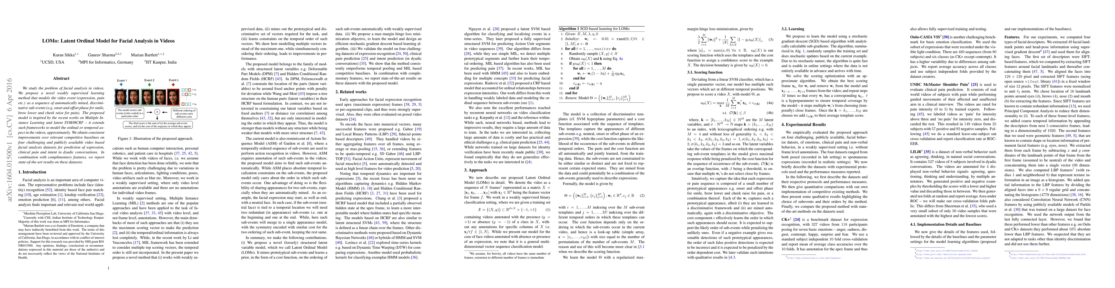 The paper introduces LOMo, a novel weakly supervised learning method for facial analysis in videos, which models video events as sequences of ordinal sub-events. The proposed Latent Ordinal Model achieves state-of-the-art results on multiple datasets for expression, pain, and intent prediction.