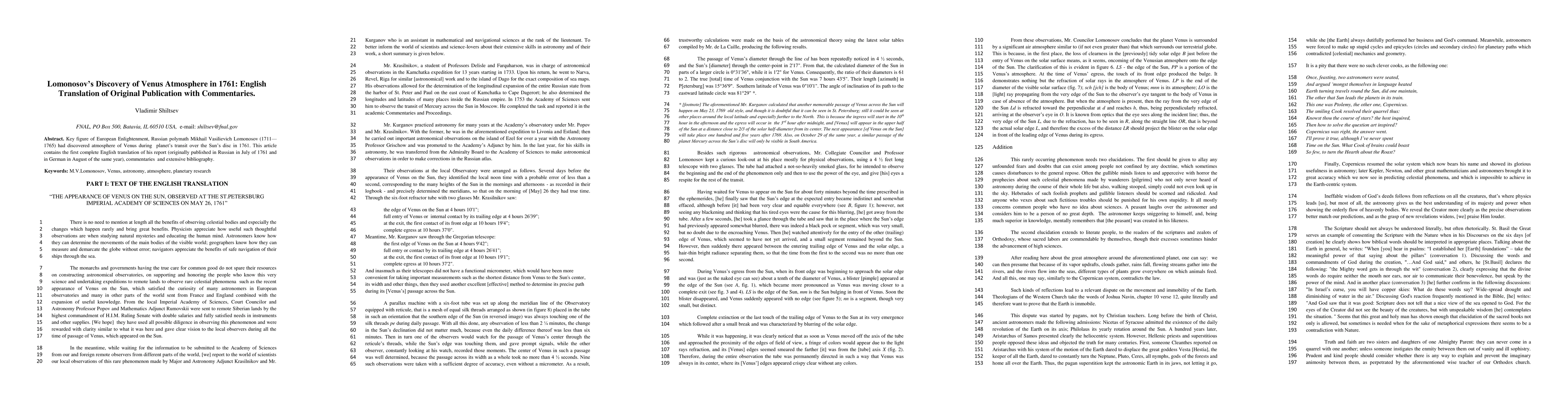 Key figure of Russian Enlightenment, polymath Mikhail Vasilievich Lomonosov (1711-1765) had discovered atmosphere of Venus during its transit over the Sun's disc in 1761. This paper contains the first full English translation of his report (originally published in Russian in July of 1761 and in German in August of the same year), commentaries and extensive bibliography.