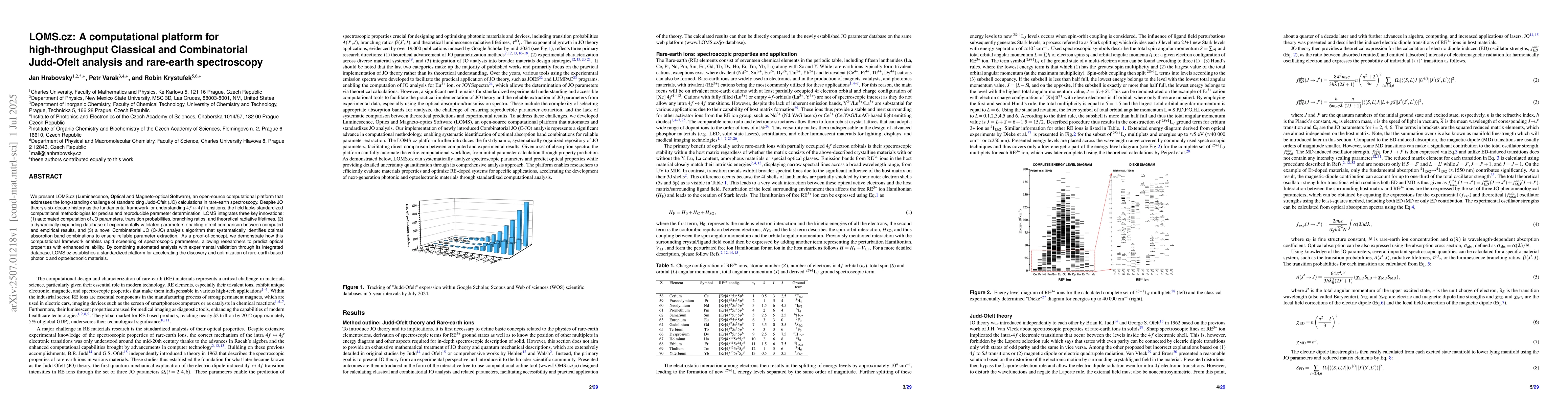 We present LOMS.cz (Luminescence, Optical and Magneto-optical Software), an open-source computational platform that addresses the long-standing challenge of standardizing Judd-Ofelt (JO) calculations in rare-earth spectroscopy. Despite JO theory's six-decade history as the fundamental framework for understanding $4f\leftrightarrow4f$ transitions, the field lacks standardized computational methodologies for precise and reproducible parameter determination. LOMS integrates three key innovations: (1) automated computation of JO parameters, transition probabilities, branching ratios, and theoretical radiative lifetimes, (2) a dynamically expanding database of experimentally validated parameters enabling direct comparison between computed and empirical results, and (3) a novel Combinatorial JO (C-JO) analysis algorithm that systematically identifies optimal absorption band combinations to ensure reliable parameter extraction. As a proof-of-concept, we demonstrate how this computational framework enables rapid screening of spectroscopic parameters, allowing researchers to predict optical properties with enhanced reliability. By combining automated analysis with experimental validation through its integrated database, LOMS.cz establishes a standardized platform for accelerating the discovery and optimization of rare-earth-based photonic and optoelectronic materials.