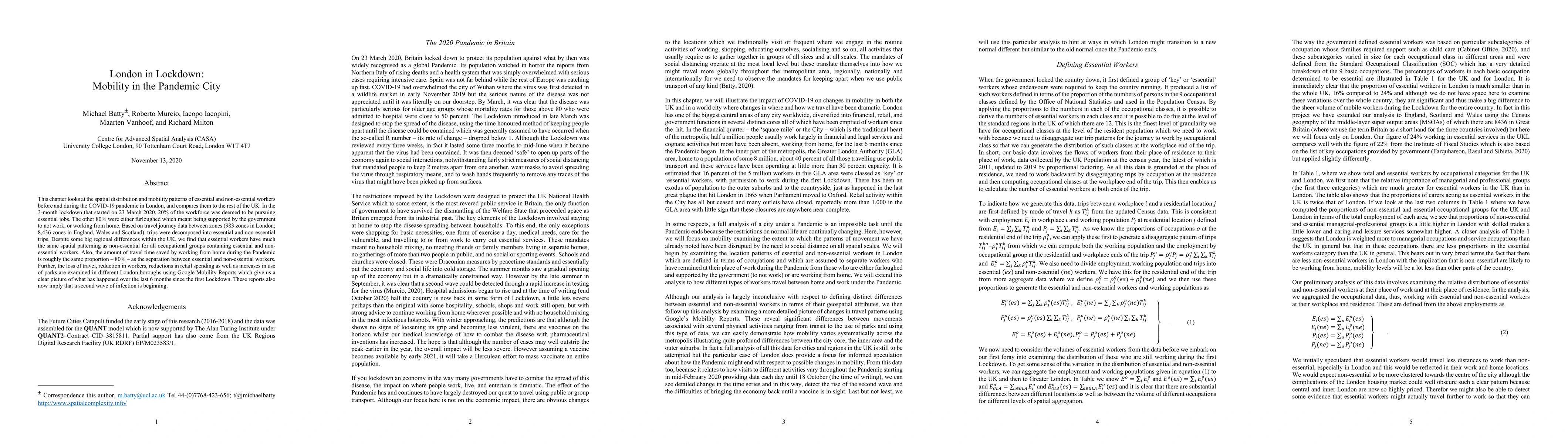 This chapter looks at the spatial distribution and mobility patterns of essential and non-essential workers before and during the COVID-19 pandemic in London and compares them to the rest of the UK. In the 3-month lockdown that started on 23 March 2020, 20% of the workforce was deemed to be pursuing essential jobs. The other 80%% were either furloughed, which meant being supported by the government to not work, or working from home. Based on travel journey data between zones (trips were decomposed into essential and non-essential trips. Despite some big regional differences within the UK, we find that essential workers have much the same spatial patterning as non-essential for all occupational groups containing essential and non-essential workers. Also, the amount of travel time saved by working from home during the Pandemic is roughly the same proportion -80%-as the separation between essential and non-essential workers. Further, the loss of travel, reduction in workers, reductions in retail spending as well as increases in use of parks are examined in different London boroughs using Google Mobility Reports which give us a clear picture of what has happened over the last 6 months since the first Lockdown. These reports also now imply that a second wave of infection is beginning.
