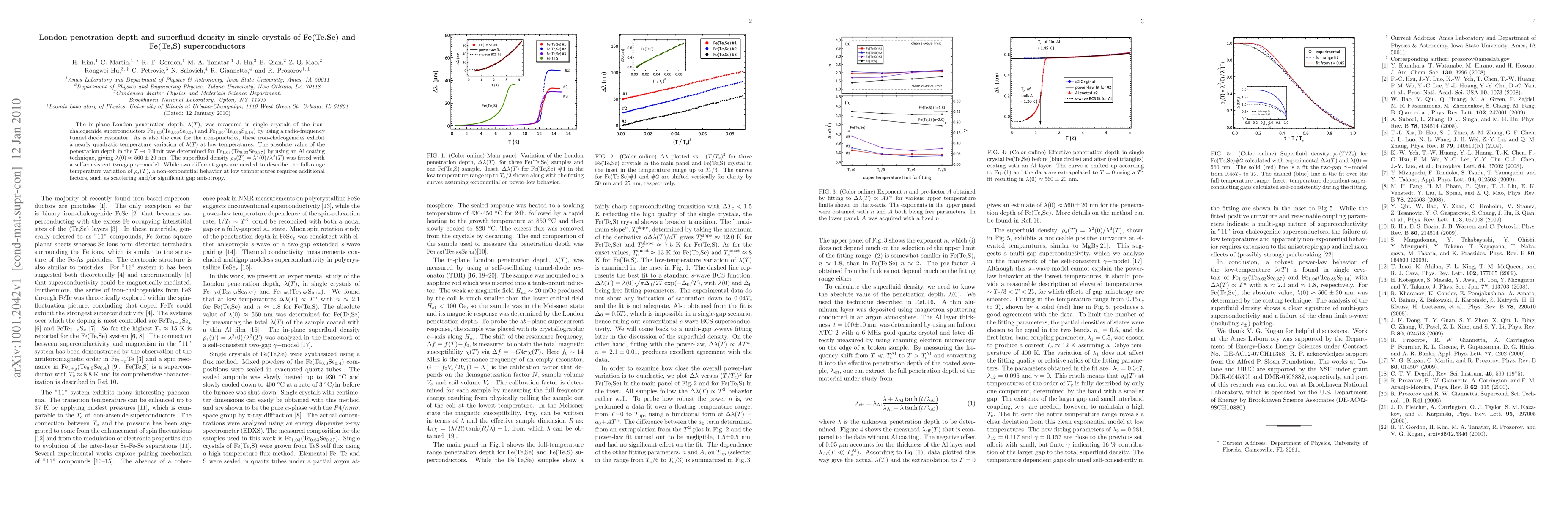 This paper measures the in-plane London penetration depth in Fe(Te,Se) and Fe(Te,S) superconductors, finding a nearly quadratic temperature dependence at low temperatures. The superfluid density is best described by a self-consistent two-gap model, indicating complex factors like scattering and gap anisotropy influence low-temperature behavior.