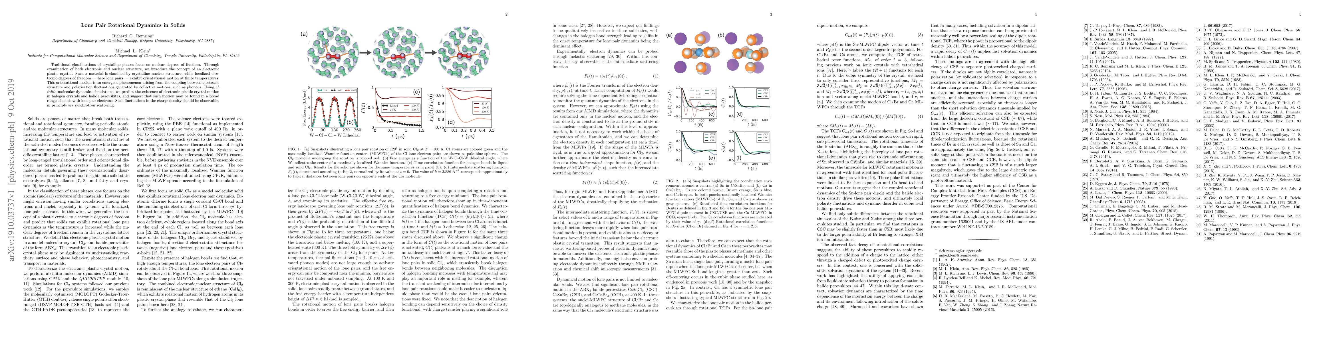 The introduction of the concept of electronic plastic crystals and the prediction of lone pair rotational dynamics in solids using ab initio molecular dynamics simulations.