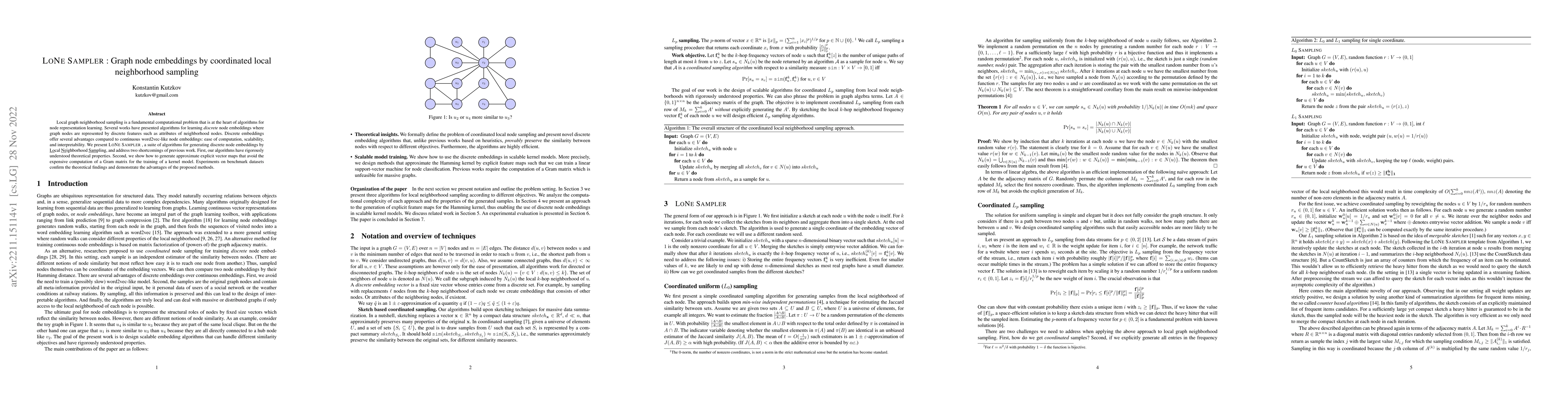 LoNe Sampler introduces algorithms for generating discrete node embeddings through local neighborhood sampling, addressing theoretical shortcomings and computational inefficiencies. The method provides scalable, interpretable, and computationally efficient embeddings, validated by experiments on benchmark datasets.