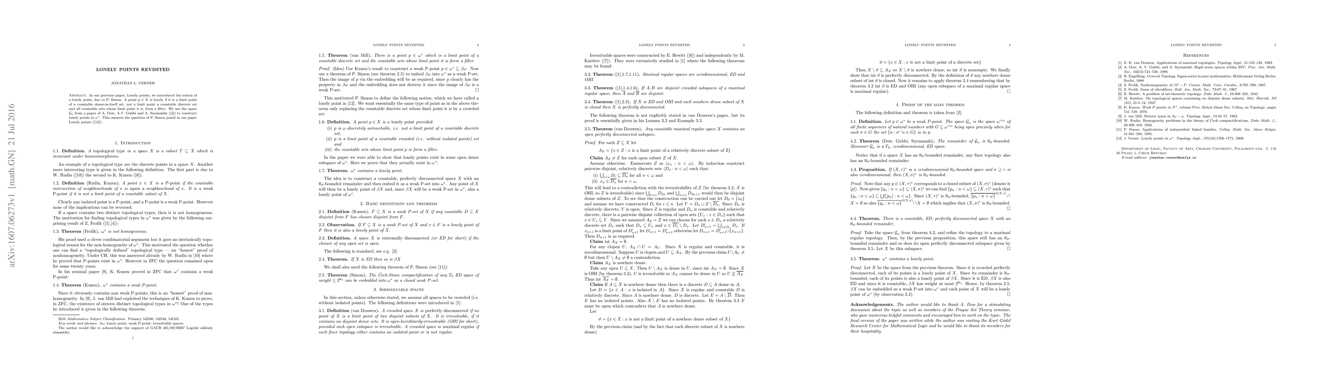 Research paper constructs lonely points in $eta ext{ℵ}_0$ using a space from 1988 paper, answering a question posed by P. Simon about the existence of such points in $eta ext{ℵ}_0$, a non-separable infinite regular cardinal.