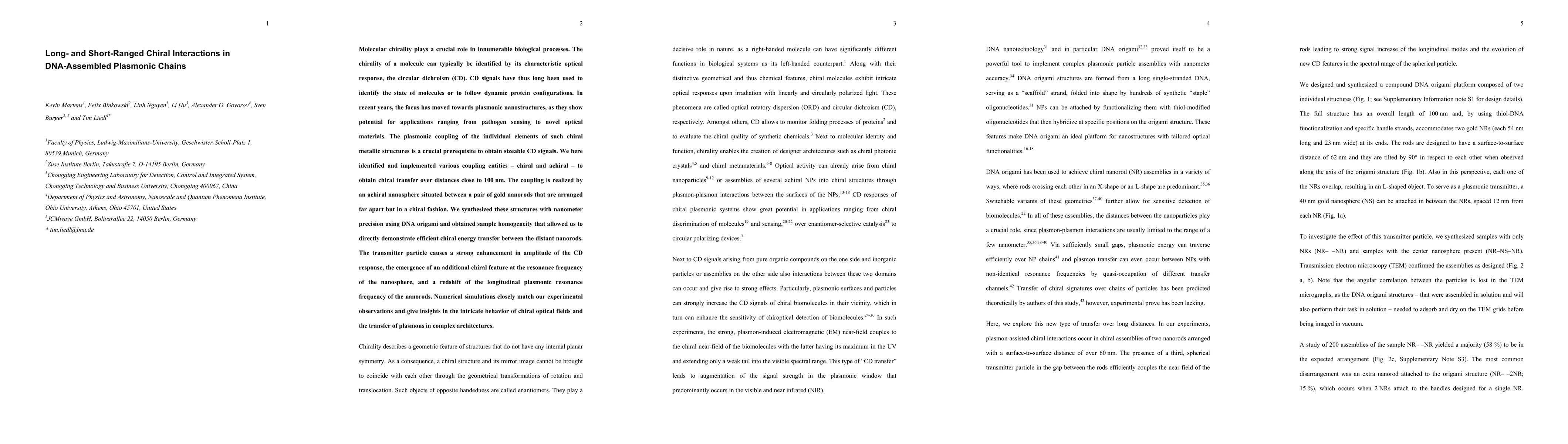 This paper investigates the long- and short-ranged chiral interactions in plasmonic chains assembled via DNA origami, demonstrating efficient chiral energy transfer over distances up to 100 nm. The study highlights the use of plasmonic coupling between gold nanorods and an achiral nanosphere to enhance circular dichroism signals, supported by numerical simulations.