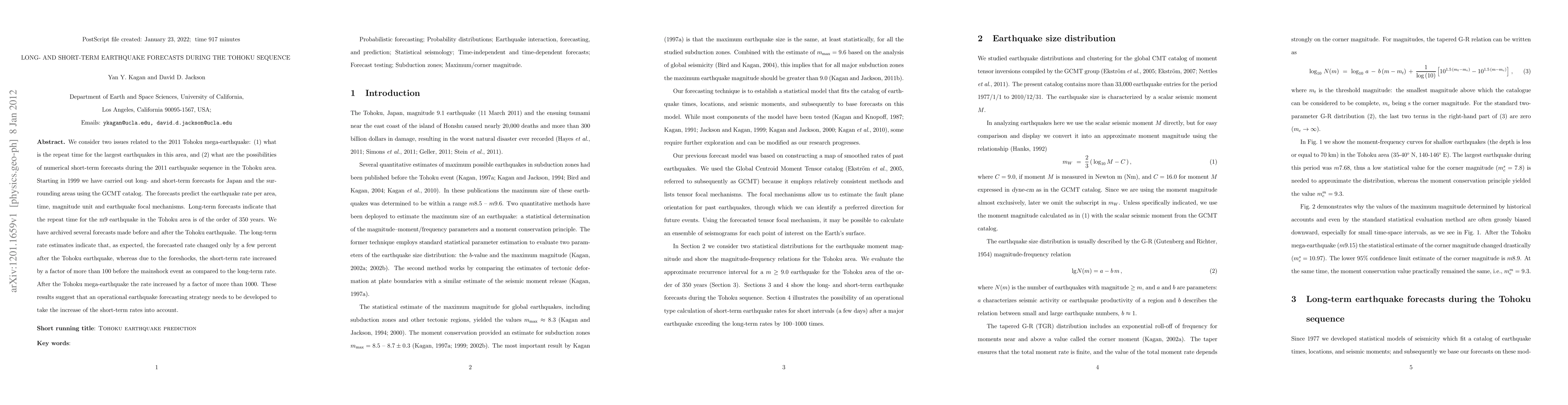 We consider two issues related to the 2011 Tohoku mega-earthquake: (1) what is the repeat time for the largest earthquakes in this area, and (2) what are the possibilities of numerical short-term forecasts during the 2011 earthquake sequence in the Tohoku area. Starting in 1999 we have carried out long- and short-term forecasts for Japan and the surrounding areas using the GCMT catalog. The forecasts predict the earthquake rate per area, time, magnitude unit and earthquake focal mechanisms. Long-term forecasts indicate that the repeat time for the m9 earthquake in the Tohoku area is of the order of 350 years. We have archived several forecasts made before and after the Tohoku earthquake. The long-term rate estimates indicate that, as expected, the forecasted rate changed only by a few percent after the Tohoku earthquake, whereas due to the foreshocks, the short-term rate increased by a factor of more than 100 before the mainshock event as compared to the long-term rate. After the Tohoku mega-earthquake the rate increased by a factor of more than 1000. These results suggest that an operational earthquake forecasting strategy needs to be developed to take the increase of the short-term rates into account.