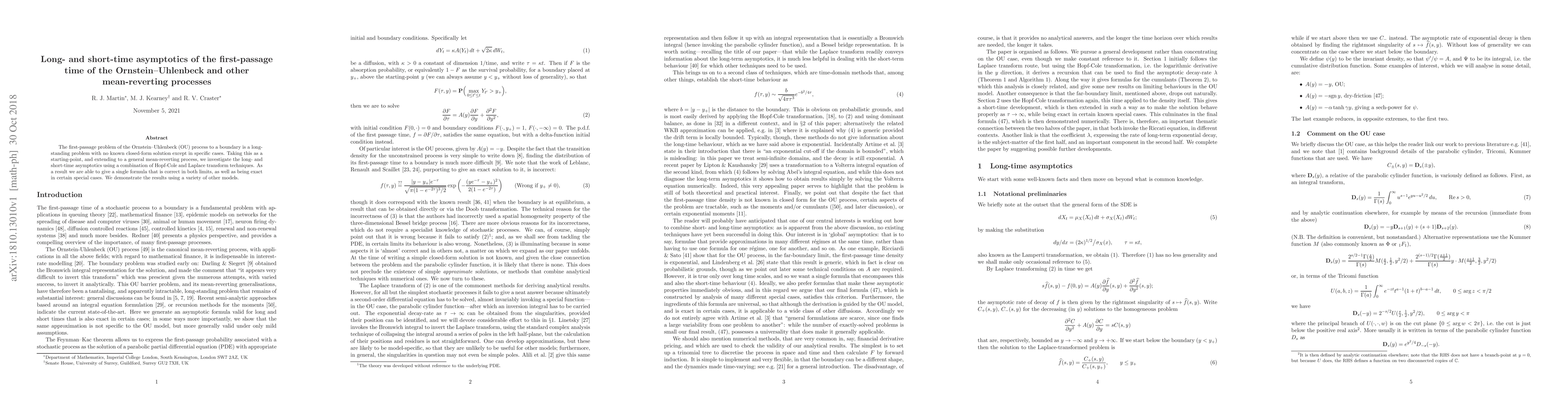 The first-passage problem of the Ornstein-Uhlenbeck process to a boundary is a long-standing problem with no known closed-form solution except in specific cases. Taking this as a starting-point, and extending to a general mean-reverting process, we investigate the long- and short-time asymptotics using a combination of Hopf-Cole and Laplace transform techniques. As a result we are able to give a single formula that is correct in both limits, as well as being exact in certain special cases. We demonstrate the results using a variety of other models.