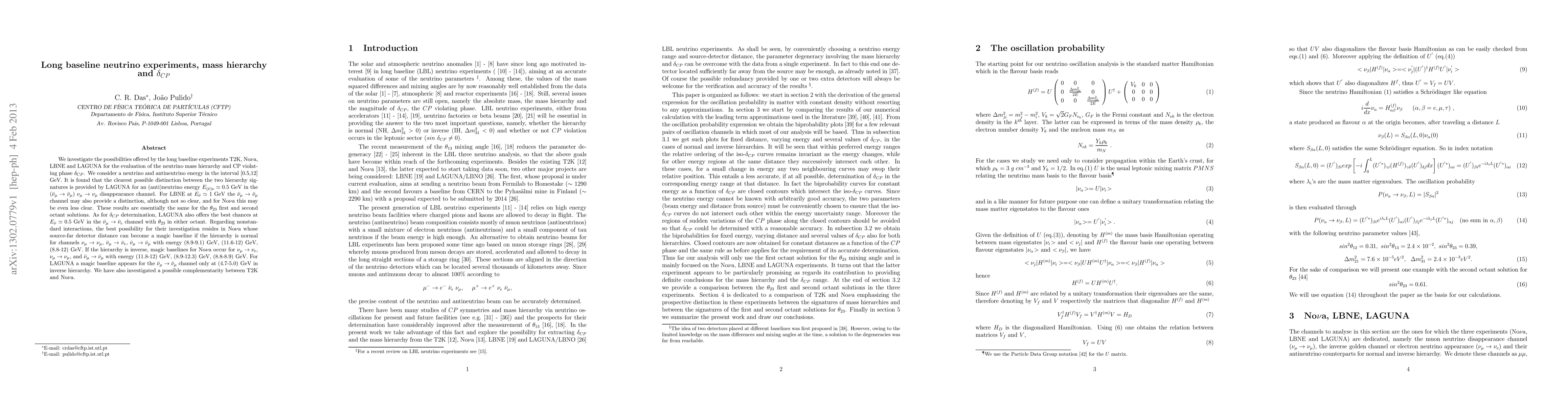 We investigate the possibilities offered by the long baseline experiments T2K, No$\nu$a, LBNE and LAGUNA for the evaluation of the neutrino mass hierarchy and CP violating phase $\delta_{CP}$. We consider a neutrino and antineutrino energy in the interval [0.5,12] GeV. It is found that the clearest possible distinction between the two hierarchy signatures is provided by LAGUNA for an (anti)neutrino energy $E_{(\bar\nu)\nu}\simeq 0.5$ GeV in the $(\bar\nu_{\mu} \rightarrow \bar\nu_{\mu}) \nu_{\mu}\rightarrow \nu_{\mu}$ disappearance channel. For LBNE at $E_{\bar\nu}\simeq 1$ GeV the $\bar\nu_{\mu}\rightarrow \bar\nu_{\mu}$ channel may also provide a distinction, although not so clear, and for No$\nu$a this may be even less clear. These results are essentially the same for the $\theta_{23}$ first and second octant solutions. As for $\delta_{CP}$ determination, LAGUNA also offers the best chances at $E_{\bar\nu}\simeq 0.5$ GeV in the $\bar\nu_{\mu}\rightarrow \bar\nu_{e}$ channel with $\theta_{23}$ in either octant. Regarding nonstandard interactions, the best possibility for their investigation resides in No$\nu$a whose source-far detector distance can become a magic baseline if the hierarchy is normal for channels $\nu_{\mu}\rightarrow \nu_{\mu}$, $\bar\nu_{\mu}\rightarrow \bar\nu_{e}$, $\bar\nu_{\mu}\rightarrow \bar\nu_{\mu}$ with energy (8.9-9.1) GeV, (11.6-12) GeV, (8.8-12) GeV. If the hierarchy is inverse, magic baselines for No$\nu$a occur for $\nu_{\mu}\rightarrow \nu_{e}$, $\nu_{\mu}\rightarrow \nu_{\mu}$, and $\bar\nu_{\mu}\rightarrow \bar\nu_{\mu}$ with energy (11.8-12) GeV, (8.9-12.3) GeV, (8.8-8.9) GeV. For LAGUNA a magic baseline appears for the $\bar\nu_{\mu}\rightarrow \bar\nu_{\mu}$ channel only at (4.7-5.0) GeV in inverse hierarchy. We have also investigated a possible complementarity between T2K and No$\nu$a.