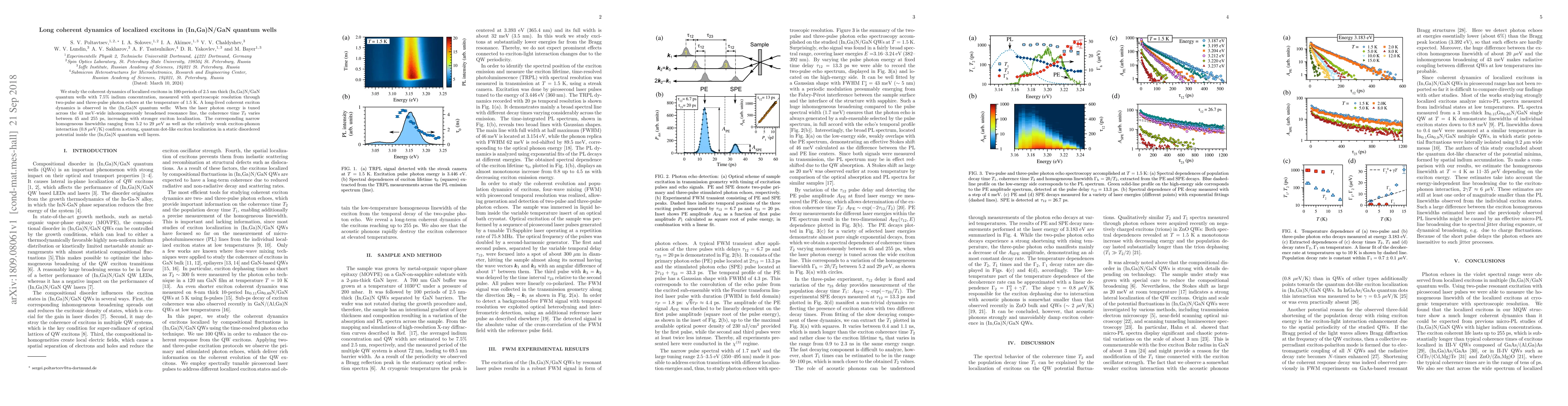We study the coherent dynamics of localized excitons in 100-periods of 2.5 nm thick (In,Ga)N/GaN quantum wells with 7.5% indium concentration, measured with spectroscopic resolution through two-pulse and three-pulse photon echoes at the temperature of 1.5 K. A long-lived coherent exciton dynamics is observed in the (In,Ga)N quantum wells: When the laser photon energy is tuned across the 43 meV-wide inhomogeneously broadened resonance line, the coherence time T2 varies between 45 and 255 ps, increasing with stronger exciton localization. The corresponding narrow homogeneous linewidths ranging from 5.2 to 29 {\mu}eV as well as the relatively weak exciton-phonon interaction (0.8 {\mu}eV/K) confirm a strong, quantum dot-like exciton localization in a static disordered potential inside the (In,Ga)N quantum well layers.