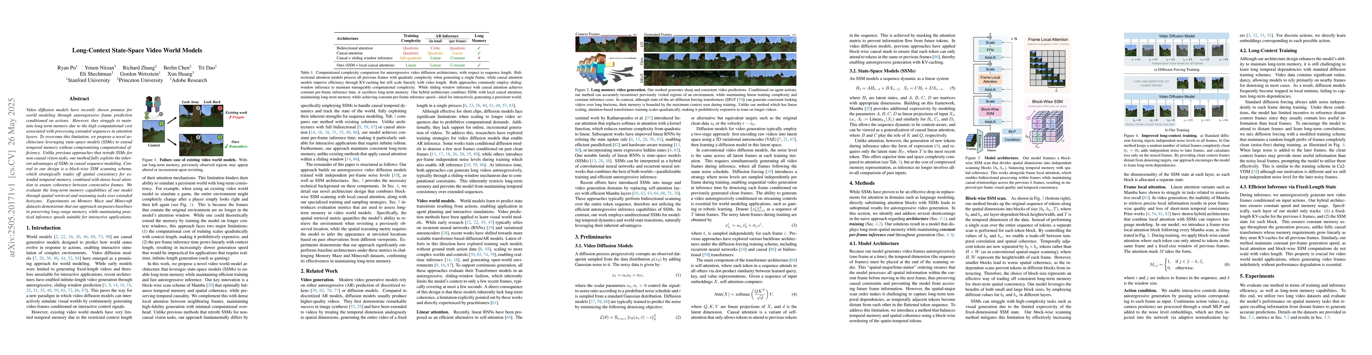 This work stands out by fully exploiting the causal advantages of state-space models within the autoregressive frame prediction framework of video diffusion models, rather than retrofitting them, thus offering a more coherent and efficient solution for long-term memory in video world modeling.