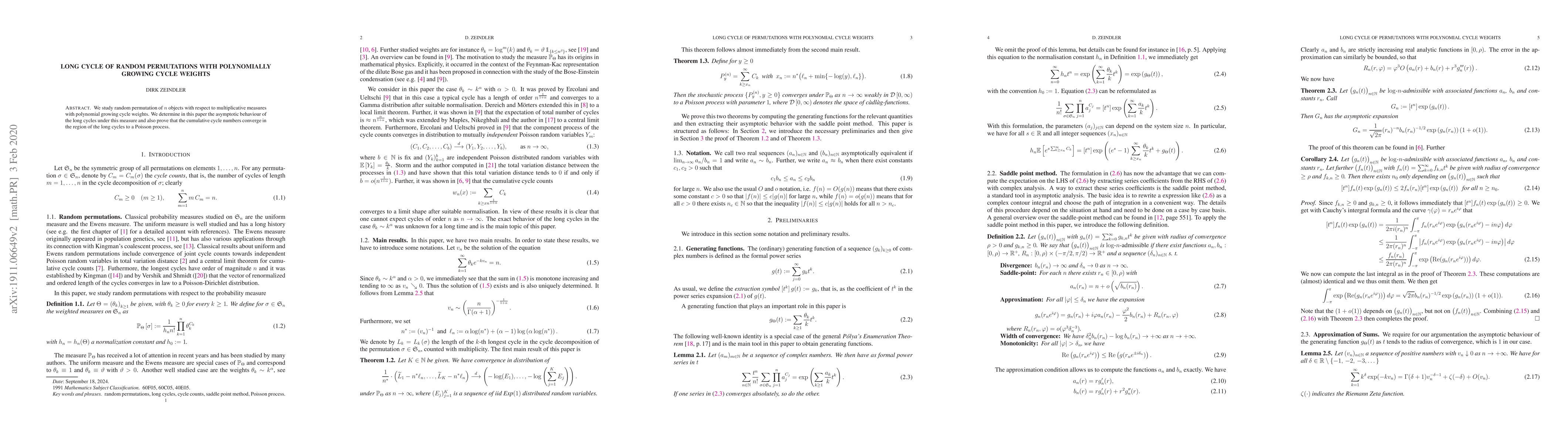 This paper investigates the asymptotic behavior of long cycles in random permutations of $n$ objects under polynomially growing cycle weights, demonstrating that normalized longest cycle lengths converge to independent identically distributed random variables with exponentially distributed $\exp(-Z_j)$. The analysis employs generating functions and the saddle point method.