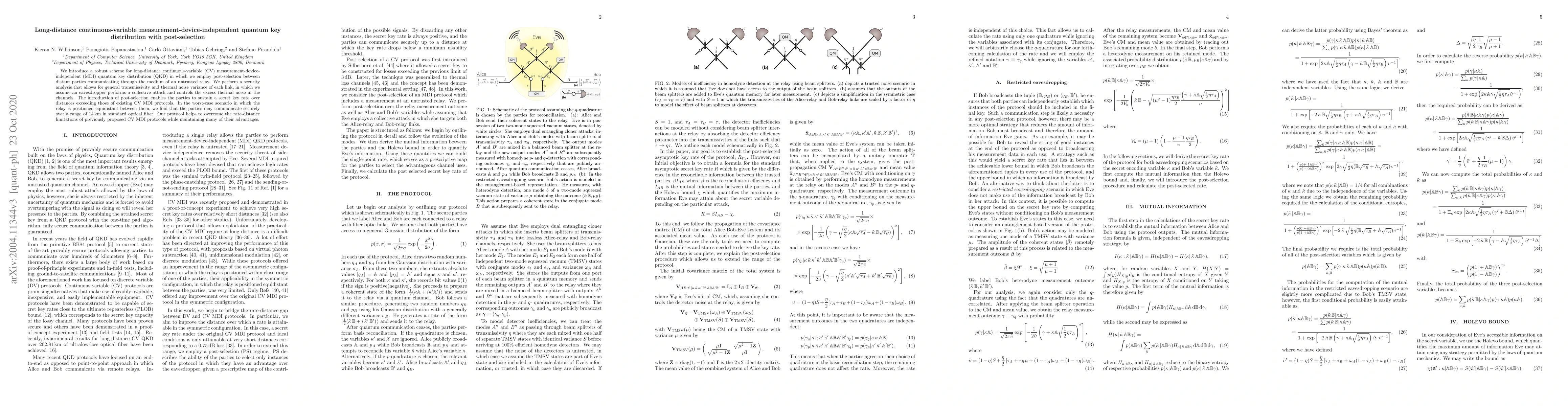 We introduce a robust scheme for long-distance continuous-variable (CV) measurement-device-independent (MDI) quantum key distribution (QKD) in which we employ post-selection between distant parties communicating through the medium of an untrusted relay. We perform a security analysis that allows for general transmissivity and thermal noise variance of each link, in which we assume an eavesdropper performs a collective attack and controls the excess thermal noise in the channels. The introduction of post-selection enables the parties to sustain a secret key rate over distances exceeding those of existing CV MDI protocols. In the worst-case scenario in which the relay is positioned equidistant between them, we find that the parties may communicate securely over a range of 14 km in standard optical fiber. Our protocol helps to overcome the rate-distance limitations of previously proposed CV MDI protocols while maintaining many of their advantages.
