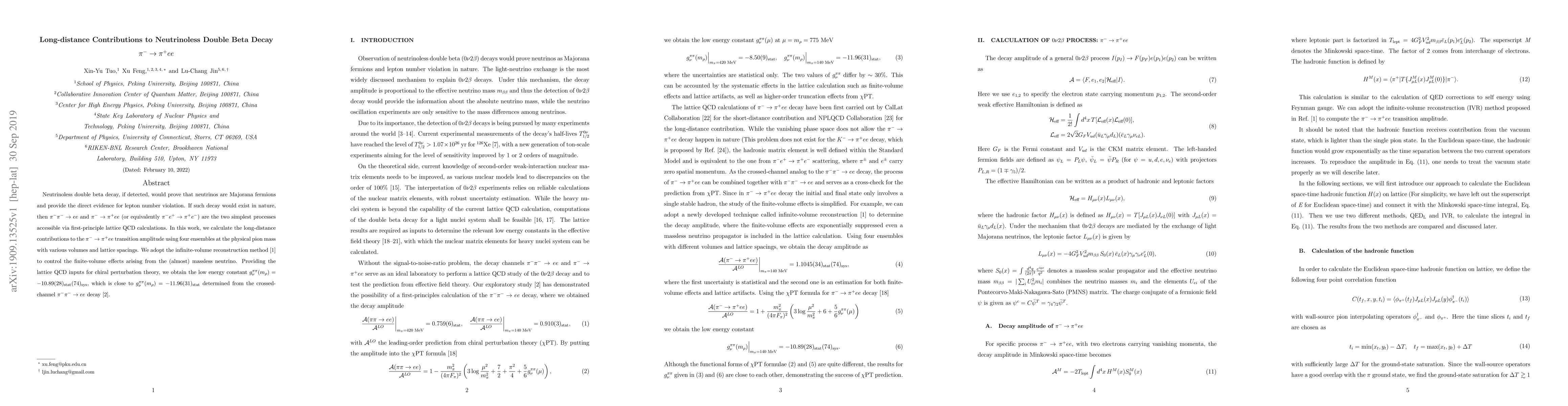 Neutrinoless double beta decay, if detected, would prove that neutrinos are Majorana fermions and provide the direct evidence for lepton number violation. If such decay would exist in nature, then $\pi^-\pi^-\to ee$ and $\pi^-\to\pi^+ ee$ (or equivalently $\pi^-e^+\to\pi^+ e^-$) are the two simplest processes accessible via first-principle lattice QCD calculations. In this work, we calculate the long-distance contributions to the $\pi^-\to\pi^+ee$ transition amplitude using four ensembles at the physical pion mass with various volumes and lattice spacings. We adopt the infinite-volume reconstruction method to control the finite-volume effects arising from the (almost) massless neutrino. Providing the lattice QCD inputs for chiral perturbation theory, we obtain the low energy constant $g_\nu^{\pi\pi}(m_\rho)=-10.89(28)_\text{stat}(74)_\text{sys}$, which is close to $g_\nu^{\pi\pi}(m_\rho)=-11.96(31)_\text{stat}$ determined from the crossed-channel $\pi^-\pi^-\to ee$ decay.