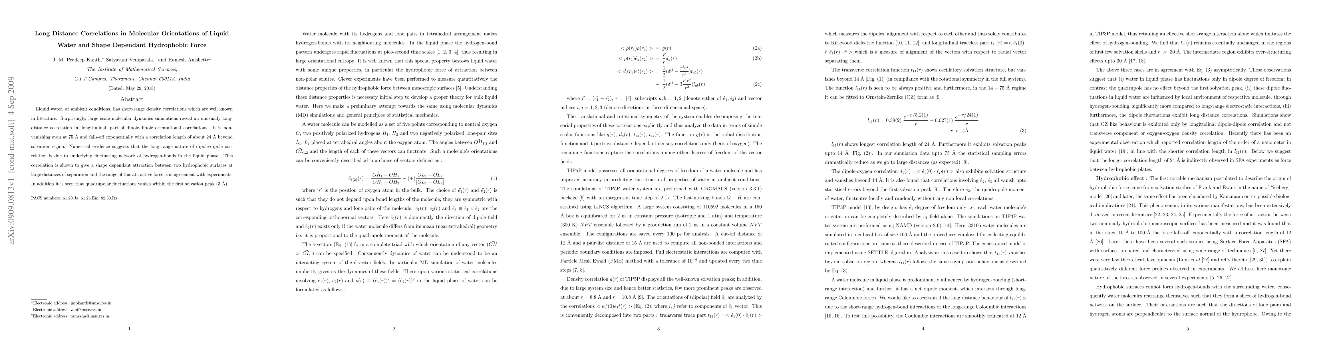 Liquid water, at ambient conditions, has short-range density correlations which are well known in literature. Surprisingly, large scale molecular dynamics simulations reveal an unusually long-distance correlation in `longitudinal' part of dipole-dipole orientational correlations. It is non-vanishing even at 75 \AA{} and falls-off exponentially with a correlation length of about 24 \AA{} beyond solvation region. Numerical evidence suggests that the long range nature of dipole-dipole correlation is due to underlying fluctuating network of hydrogen-bonds in the liquid phase. This correlation is shown to give a shape dependant attraction between two hydrophobic surfaces at large distances of separation and the range of this attractive force is in agreement with experiments. In addition it is seen that quadrupolar fluctuations vanish within the first solvation peak (3 \AA{})