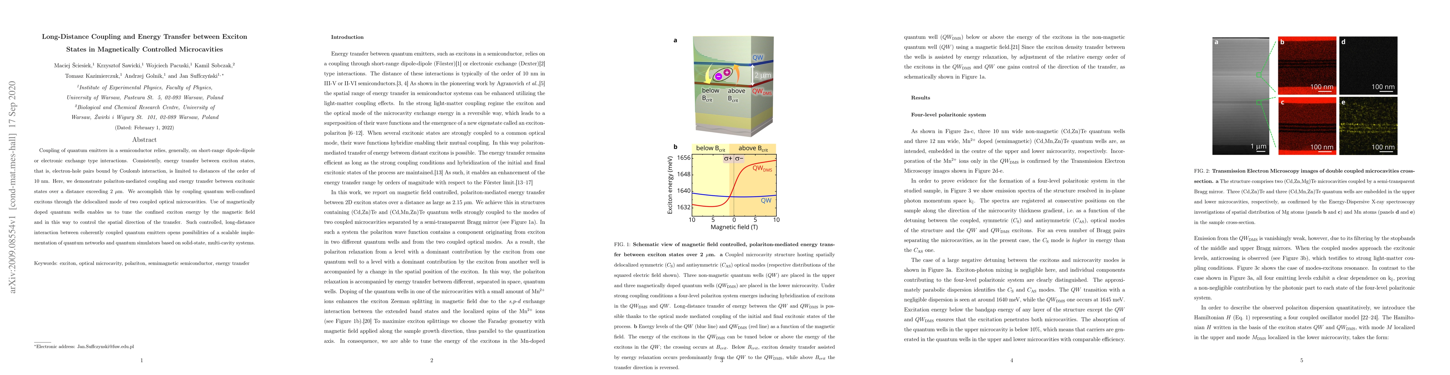 This paper demonstrates long-distance coupling and energy transfer between exciton states in magnetically controlled microcavities, mediated by polaritons, exceeding 2~$\mu$m. The use of magnetically doped quantum wells allows for tuning and controlling the spatial direction of energy transfer, paving the way for scalable quantum networks and simulators.