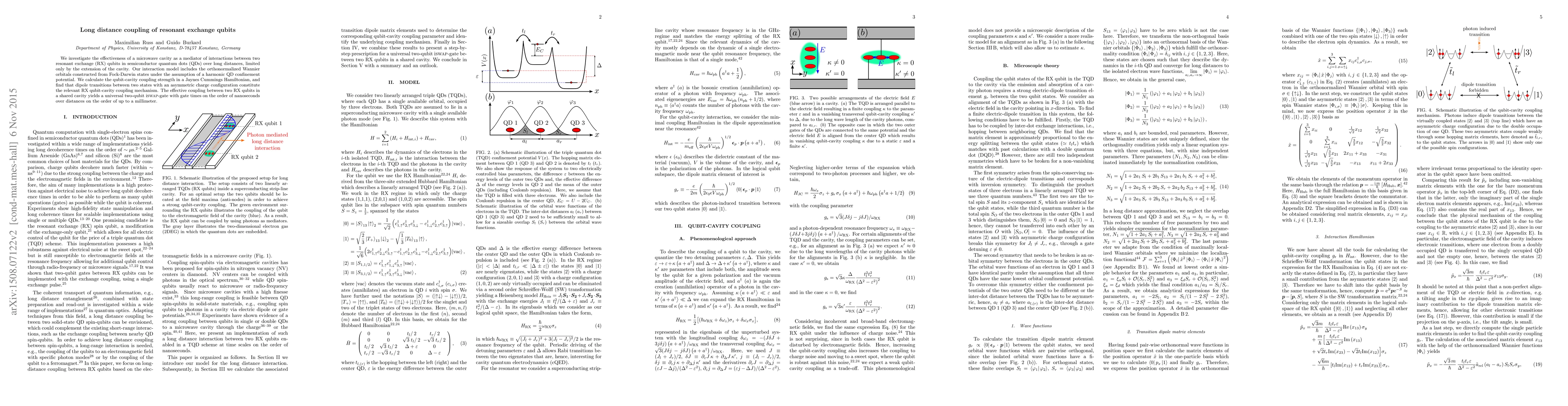 This paper explores the use of a microwave cavity to mediate interactions between two resonant exchange qubits in semiconductor quantum dots over long distances, demonstrating effective coupling and nanosecond-scale iSWAP-gate operations up to a millimeter apart. The study employs a Jaynes-Cummings Hamiltonian and identifies asymmetric charge configuration dipole transitions as the key coupling mechanism.