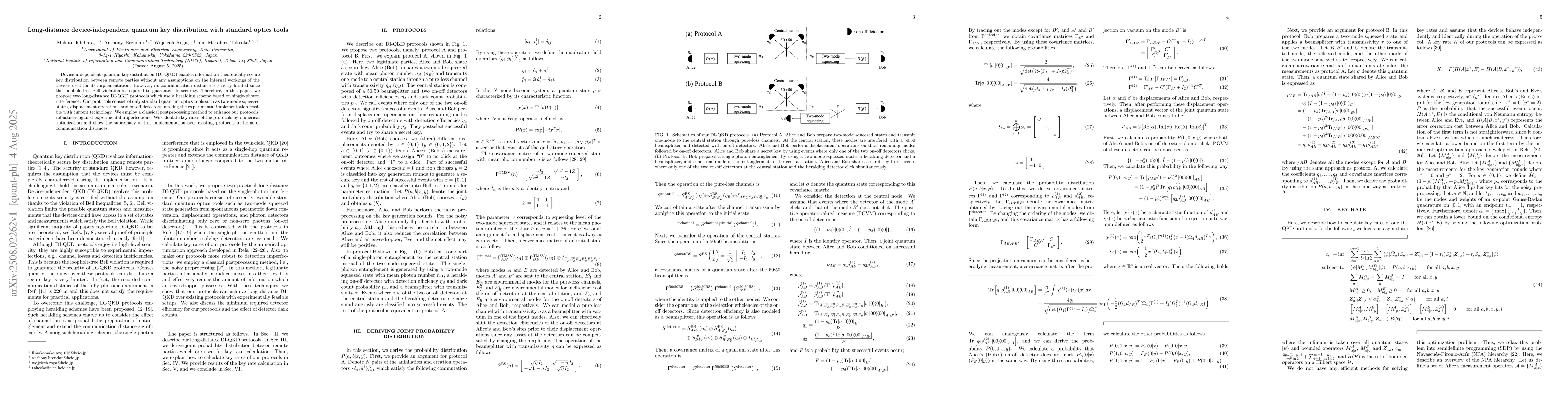 Device-independent quantum key distribution (DI-QKD) enables information-theoretically secure key distribution between remote parties without any assumptions on the internal workings of the devices used for its implementation. However, its communication distance is strictly limited since the loophole-free Bell violation is required to guarantee its security. Therefore, in this paper, we propose two long-distance DI-QKD protocols which use a heralding scheme based on single-photon interference. Our protocols consist of only standard quantum optics tools such as two-mode squeezed states, displacement operations and on-off detectors, making the experimental implementation feasible with current technology. We employ a classical postprocessing method to enhance our protocols' robustness against experimental imperfections. We calculate key rates of the protocols by numerical optimization and show the supremacy of this implementation over existing protocols in terms of communication distances.