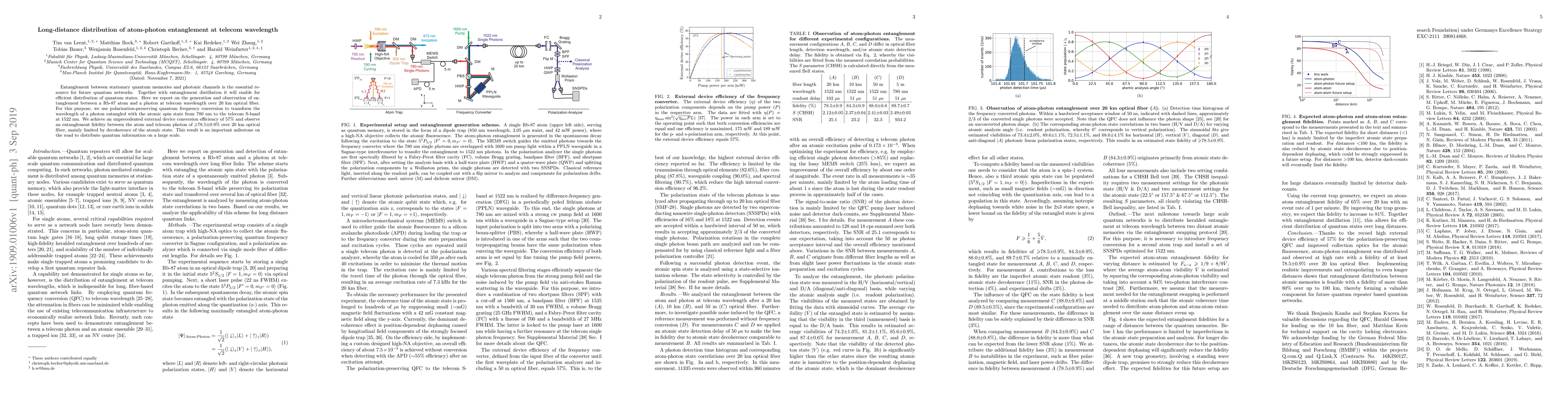 This paper reports on generating and maintaining entanglement between a Rb-87 atom and a photon at telecom wavelength over 20 km of optical fiber, achieving a high fidelity of 78.5±0.9% and a conversion efficiency of 57%, which is crucial for the large-scale distribution of quantum information.