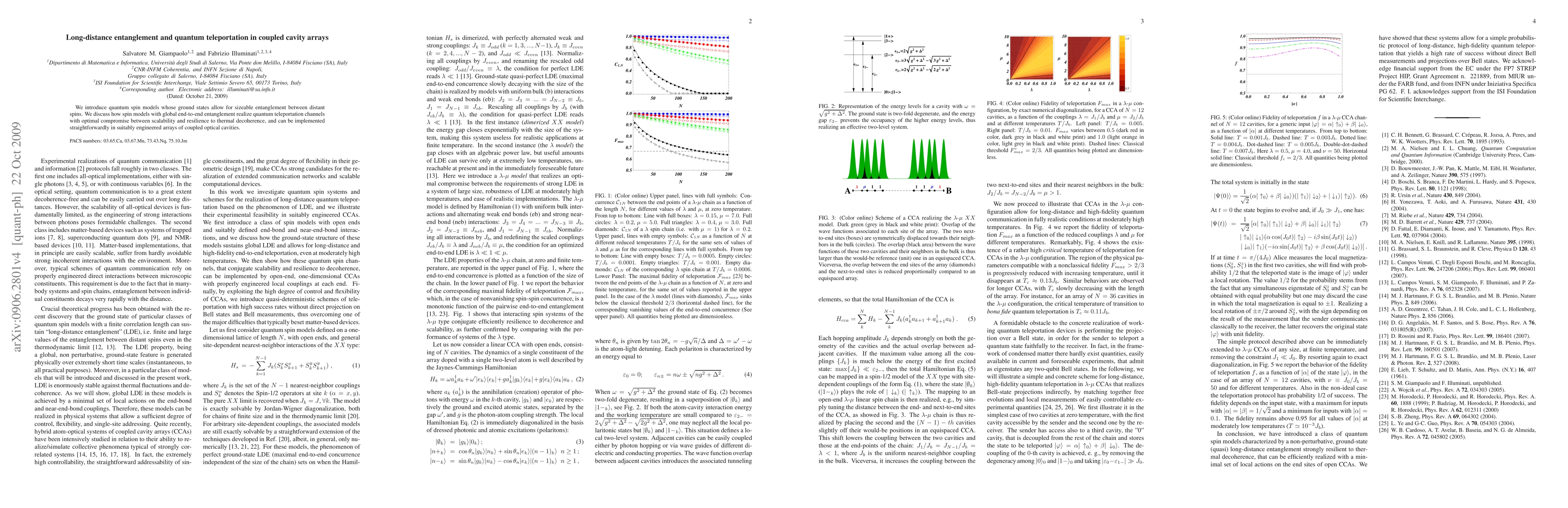 Summary: This paper presents quantum spin models enabling significant long-distance entanglement and proposes their implementation in coupled optical cavity arrays for optimal quantum teleportation channels, balancing scalability and resilience against thermal decoherence.