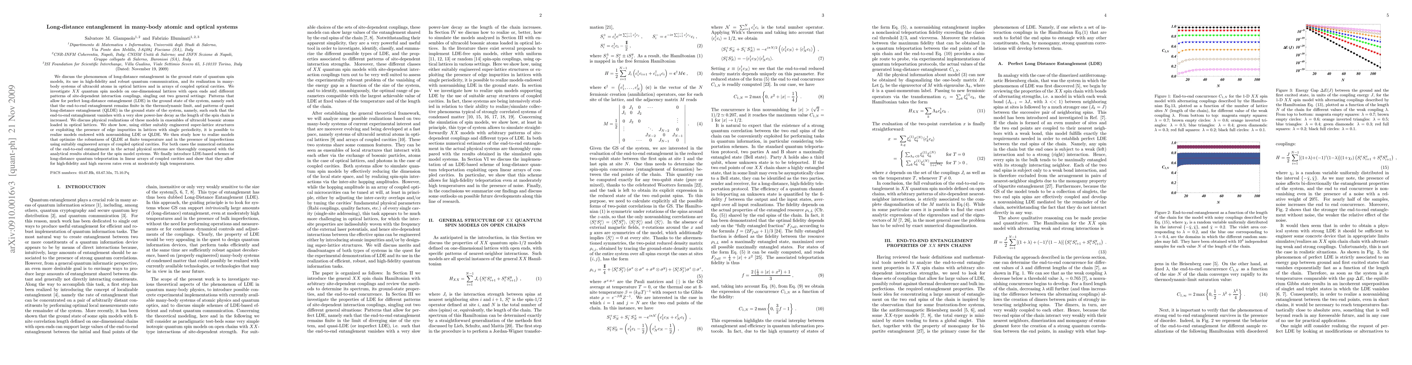 We discuss the phenomenon of long-distance entanglement in the ground state of quantum spin models, its use in high-fidelity and robust quantum communication, and its realization in many-body systems of ultracold atoms in optical lattices and in arrays of coupled optical cavities. We investigate different patterns of site-dependent interaction couplings, singling out two general settings: Patterns that allow for perfect long-distance entanglement (LDE) in the ground state of the system, namely such that the end-to-end entanglement remains finite in the thermodynamic limit, and patterns of quasi long-distance entanglement (QLDE) in the ground state of the system, namely, such such that the end-to-end entanglement vanishes with a very slow power-law decay as the length of the spin chain is increased. We discuss physical realizations of these models in ensembles of ultracold bosonic atoms loaded in optical lattices. We show how, using either suitably engineered super-lattice structures or exploiting the presence of edge impurities in lattices with single periodicity, it is possible to realize models endowed with nonvanishing LDE or QLDE. We then study how to realize models that optimize the robustness of QLDE at finite temperature and in the presence of imperfections using suitably engineered arrays of coupled optical cavities. We finally introduce LDE-based schemes of long-distance quantum teleportation in linear arrays of coupled cavities and show that they allow for high-fidelity and high success rates even at moderately high temperatures.