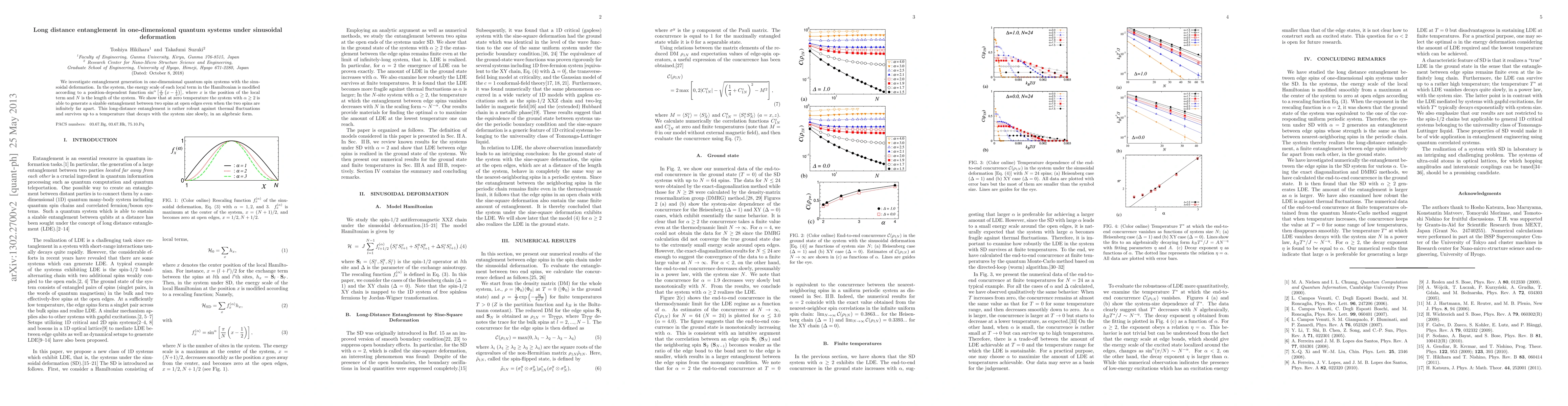 We investigate entanglement generation in one-dimensional quantum spin systems with the sinusoidal deformation. In the system, the energy scale of each local term in the Hamiltonian is modified according to a position-dependent function \sin^\alpha[\frac{\pi}{N} (x - \frac{1}{2})], where x is the position of the local term and N is the length of the system. We show that at zero temperature the system with \alpha \ge 2 is able to generate a sizable entanglement between two spins at open edges even when the two spins are infinitely far apart. This long-distance entanglement is rather robust against thermal fluctuations and survives up to a temperature that decays with the system size slowly, in an algebraic form.