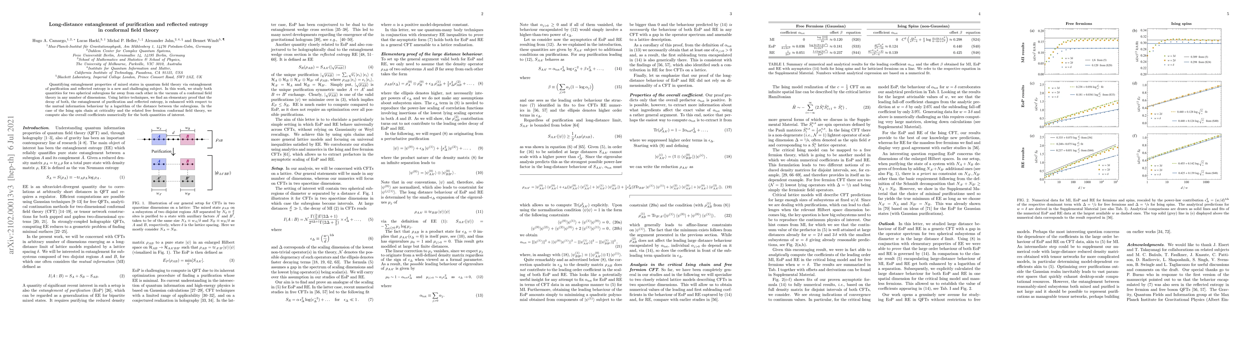 This research investigates the entanglement properties of mixed states in conformal field theory using entanglement of purification and reflected entropy. It finds that both quantities decay logarithmically with distance between subregions, enhancing mutual information decay, and computes coefficients for these quantities in the Ising spin chain and free fermion systems.