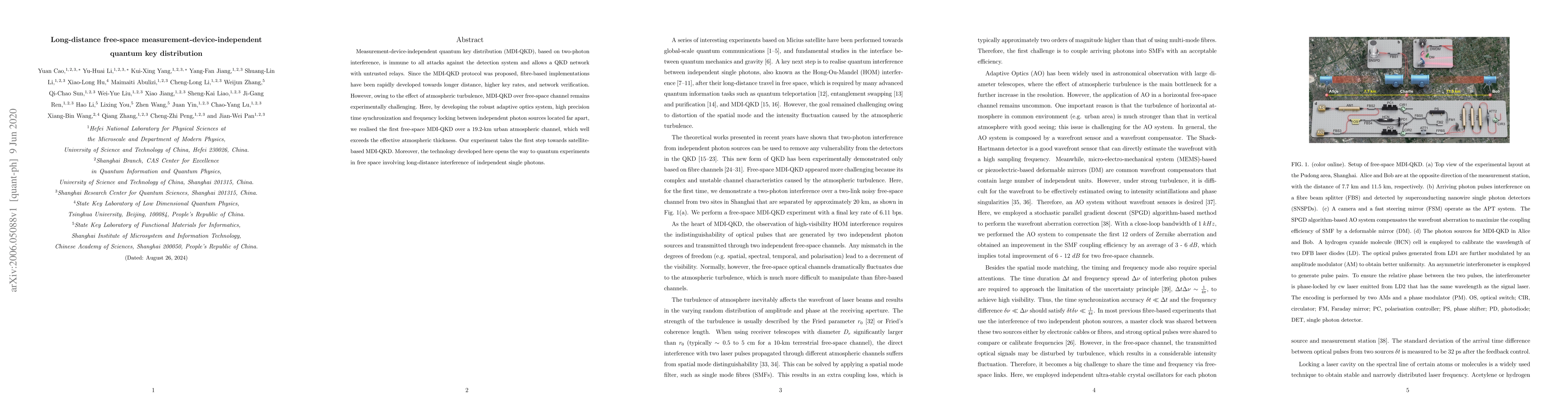 This paper reports the first successful implementation of measurement-device-independent quantum key distribution (MDI-QKD) over a 19.2-km free-space urban atmospheric channel using adaptive optics and precise synchronization, paving the way for satellite-based quantum communication. The developed technology also enables long-distance interference experiments with independent single photons.