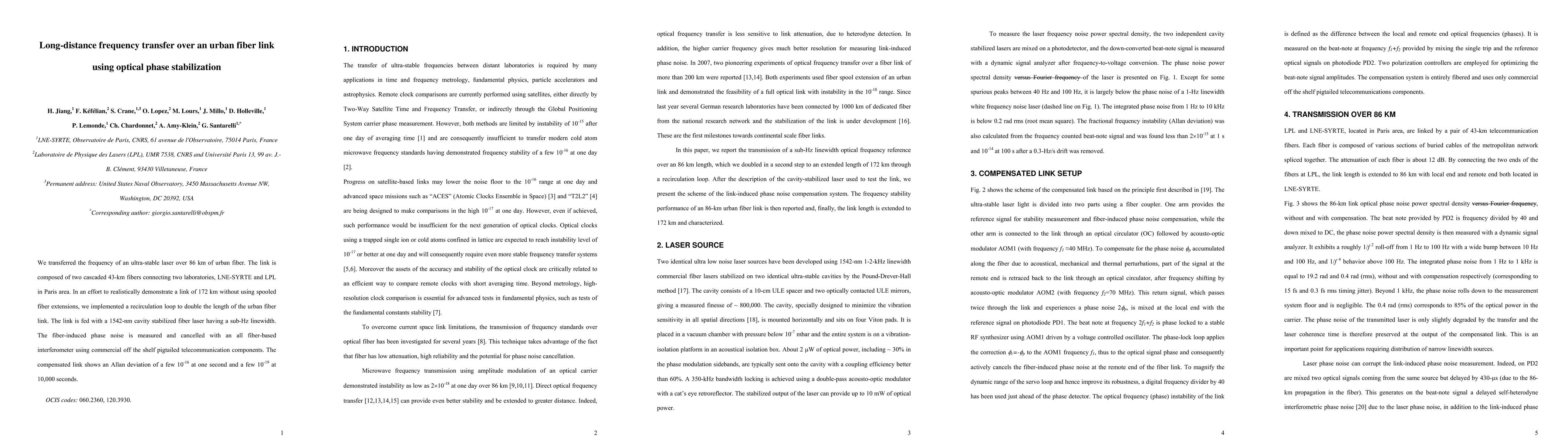 This paper details a successful transfer of an ultra-stable laser frequency over an 86 km urban fiber link using optical phase stabilization, employing a recirculation loop to simulate a 172 km link. The system achieves high precision with an Allan deviation of a few 10-16 at one second and 10-19 at 10,000 seconds.