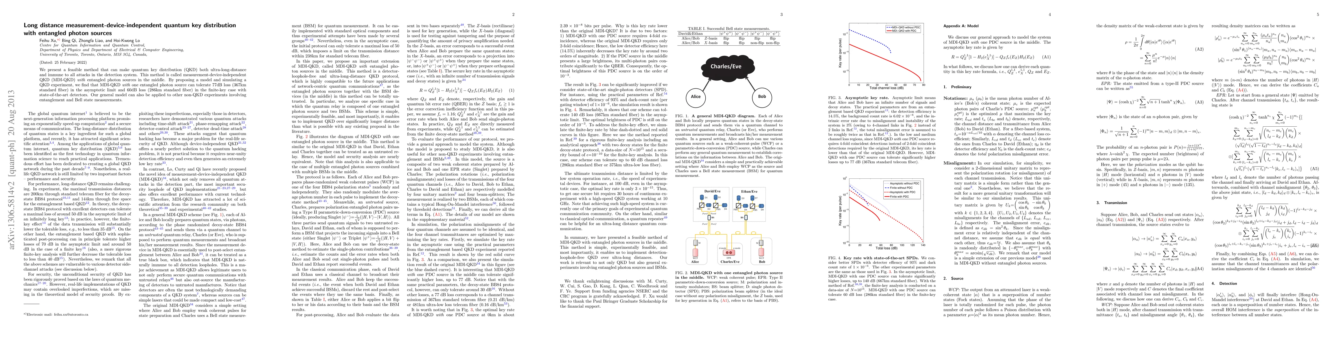 This paper proposes a method for ultra-long distance, measurement-device-independent quantum key distribution (MDI-QKD) using entangled photon sources, which can tolerate up to 77 dB of combined loss (367km) in theory and 60 dB (286km) in practical scenarios with current detectors. The method extends MDI-QKD and can be applied to other quantum experiments involving entangled photon sources.