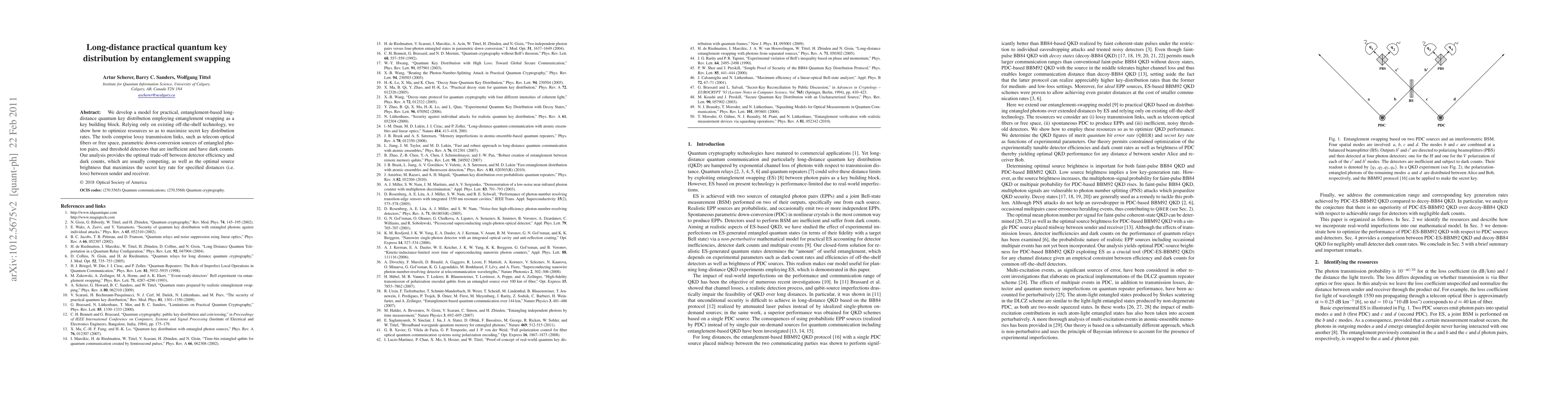 This paper presents a model for long-distance quantum key distribution using entanglement swapping, optimizing resource allocation with existing technology to maximize secret key rates. It analyzes the optimal balance between detector efficiency and dark counts, and determines the best source brightness for maximizing key rates over specified distances.