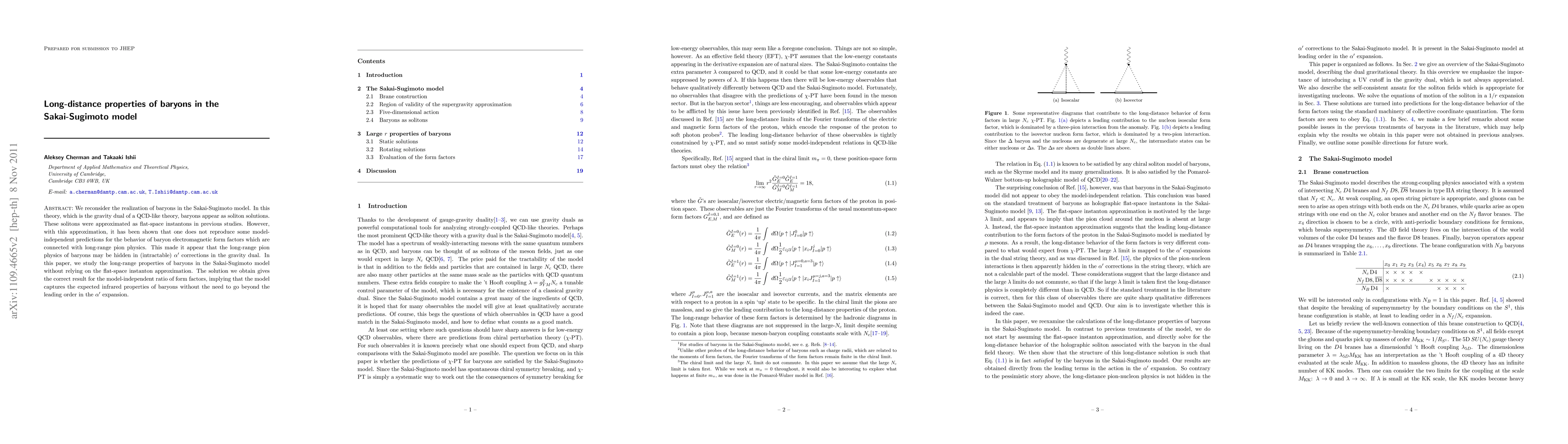 This paper examines baryons in the Sakai-Sugimoto model, finding that long-range properties can be accurately described without resorting to flat-space instanton approximations. It confirms the model's ability to reproduce model-independent predictions for baryon electromagnetic form factors, thus avoiding the need for higher-order corrections.